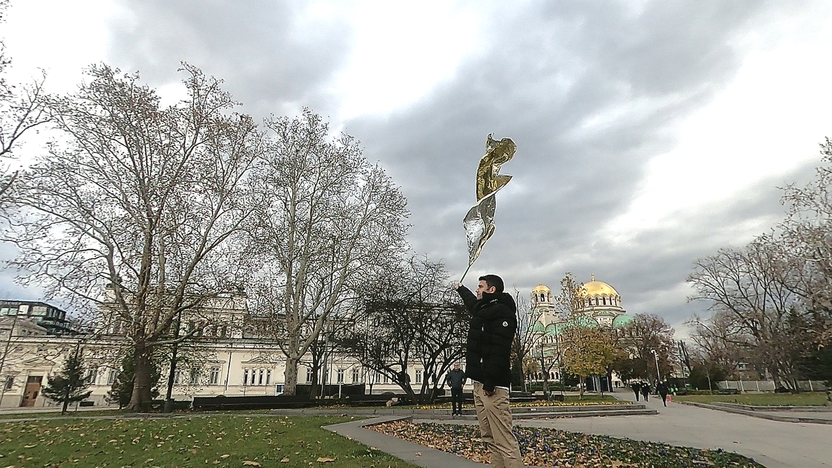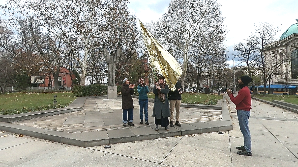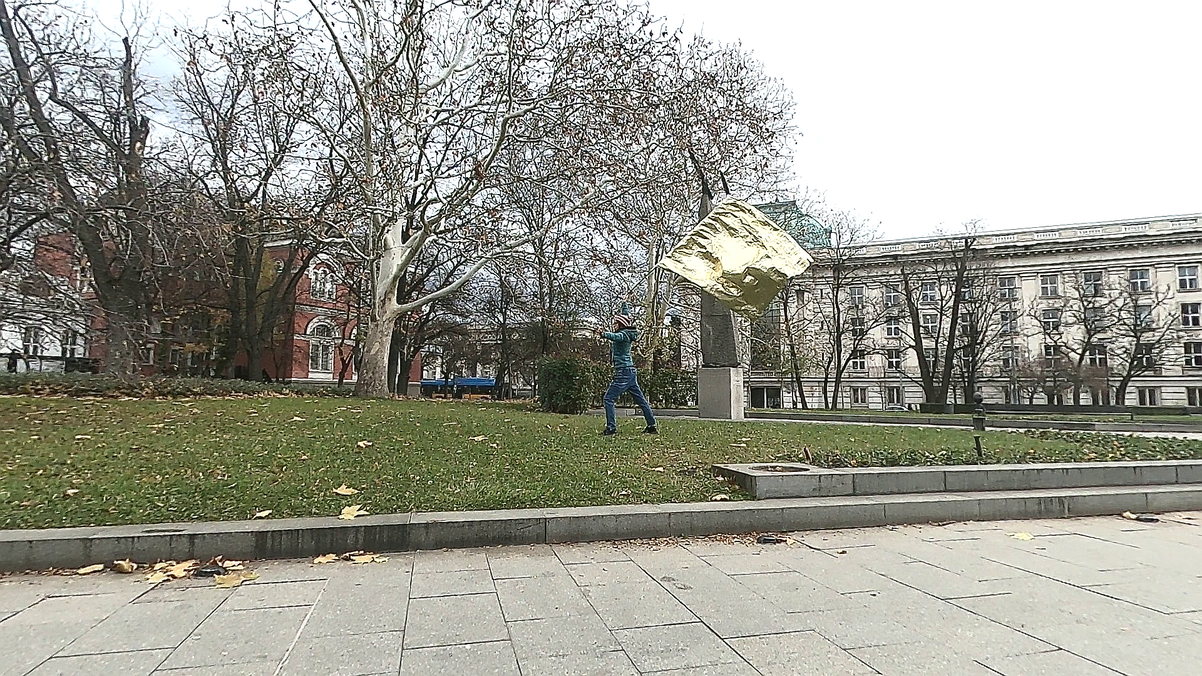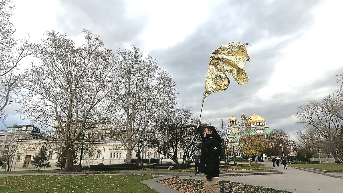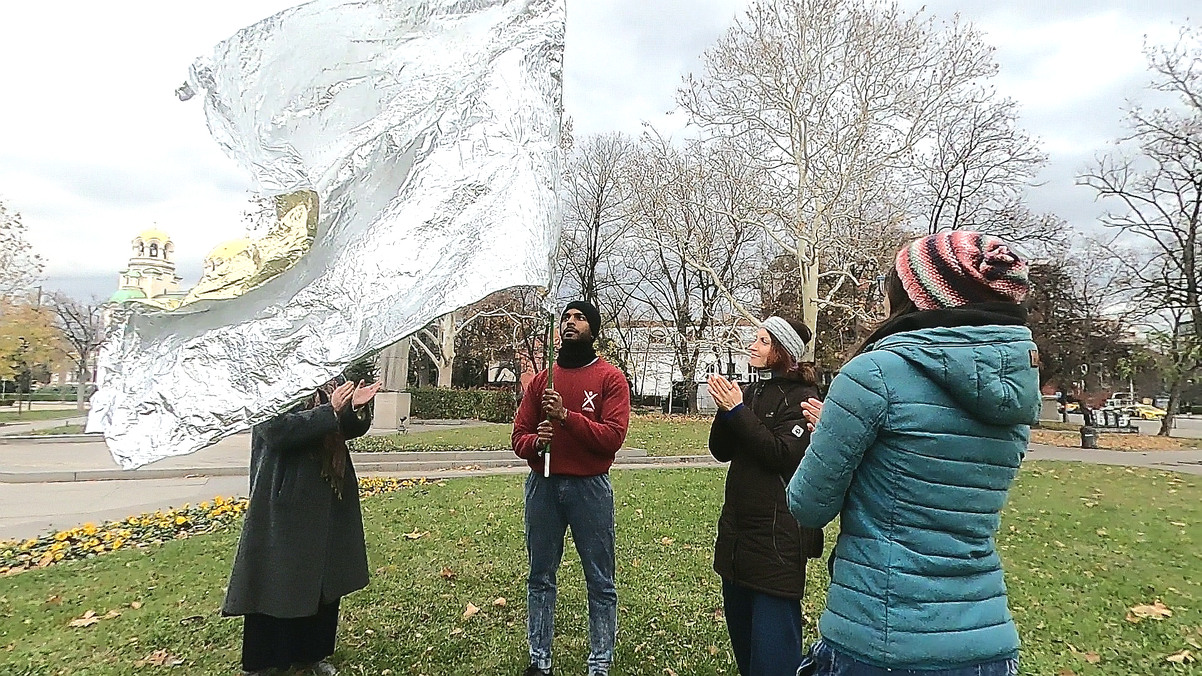Peter and the other performers are not aware of my fear. Maybe they are aware of my slight reluctance. They take it as a playful experiment. One of the performers is from Mauritius - a darker-skinned person in Bulgaria, in the winter - holding a flag. I am worried for him.