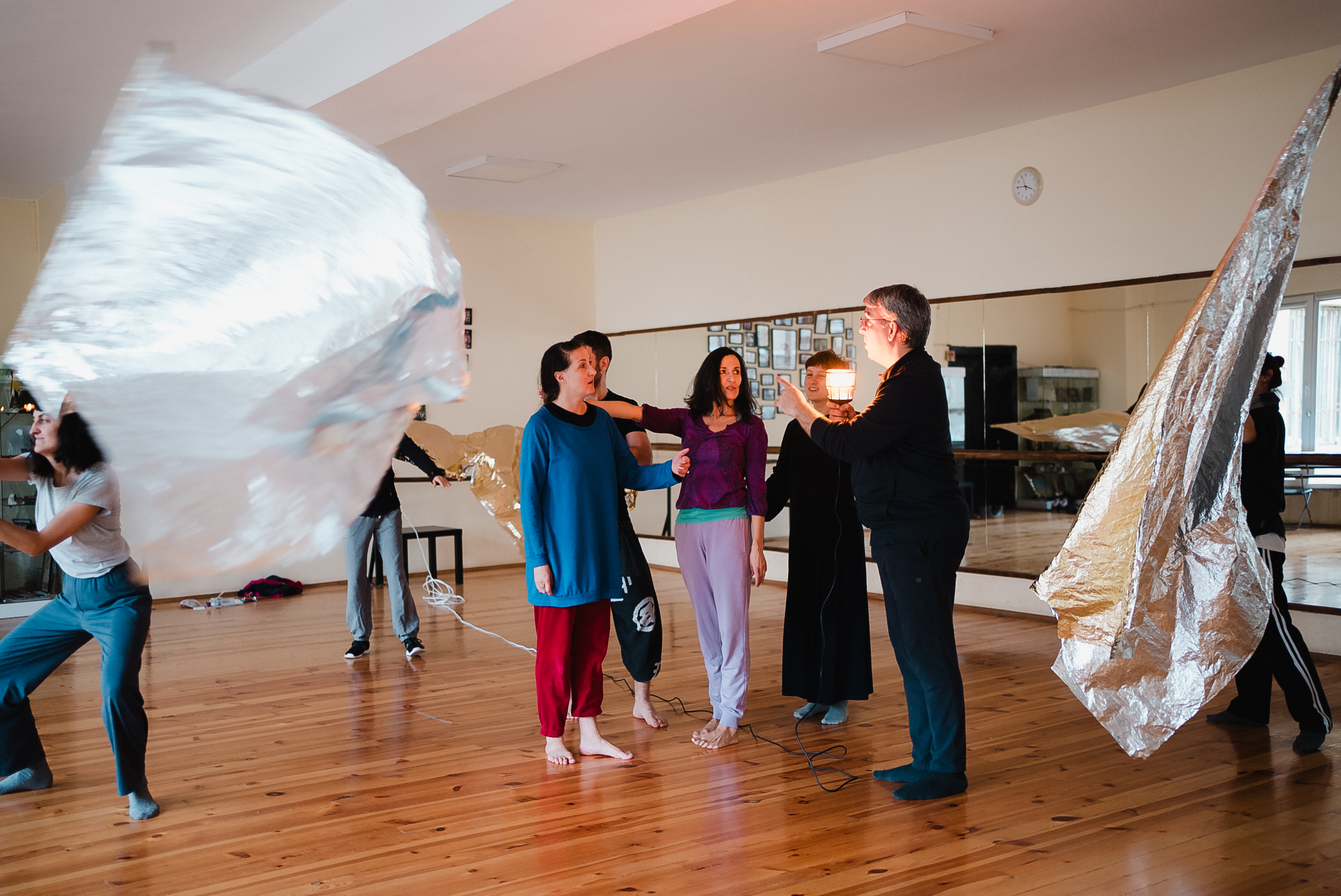As we prepared for our time together, we each brought in specific ideas we wanted to try in space. Our collaboration was set to have meetings and rehearsals with me and Peter first, then three days with the core team of four performers to explore some of the ideas and generate more, and four additional days with the large international group to make the piece.