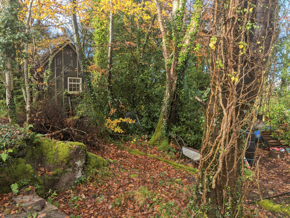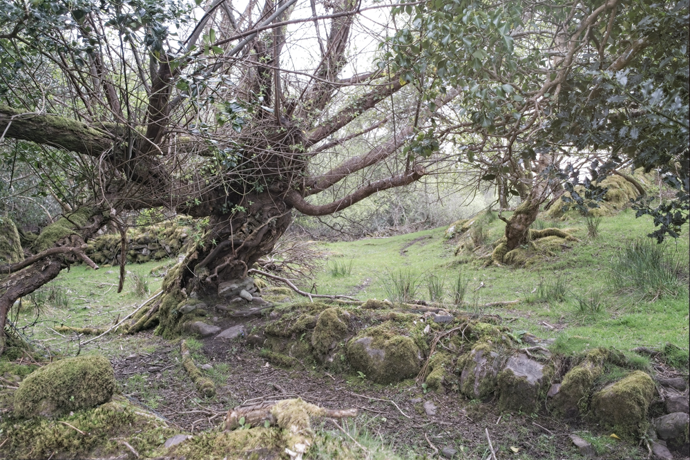 There are also a couple of images of the cottage where I stayed. The fence between the house (Jammu) and Goblinwoode ran along the south side. Hopping the fence took me to a small lane (Griffin lane) with old stone walls on either side. Following this lane for under a minute, I would arrive at an old willow tree I named Griffin, just east of Skullwillow, where flowed a stream for most of the year. Video 1 is a view up the lane. Video 2 is a compilation I assembled from clips of Skullwillow and the stream, where reflections of Goblinwoode can be seen visually entangled with the undulating movement of water. Video 3 is a shot of Goblinwoode in motion during a small wind storm.