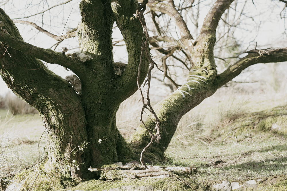 The first two images show the pair of willow trees I came to collectively call Skullwillow. These trees often served as my starting and returning point from daily wanderings. In the first image you can see how the trees formed a teardrop portal into the setting sun. Skullwillow became a collaborative site of forest bricolage, where I would position skulls, bones, shells, and other found objects. Eventually, moss and fungi would grow, the wind would blow, spiders and other insects would take up residence on these objects, resulting in a kind of slow and ongoing collaboration with flows of energy in Goblinwoode.
