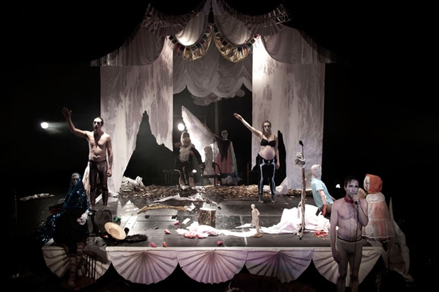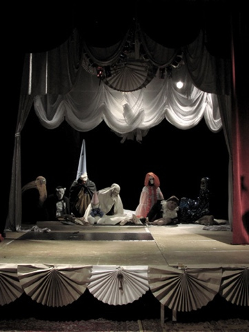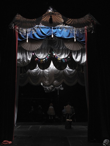 At the time we were starting to question what is special about Theatre and wanted to in some way stage “The Theatre” in the Black Box and built up a multilayered old classical theatre scene in the black box representing the eternity but also showcasing the esthetics of an old theatre.