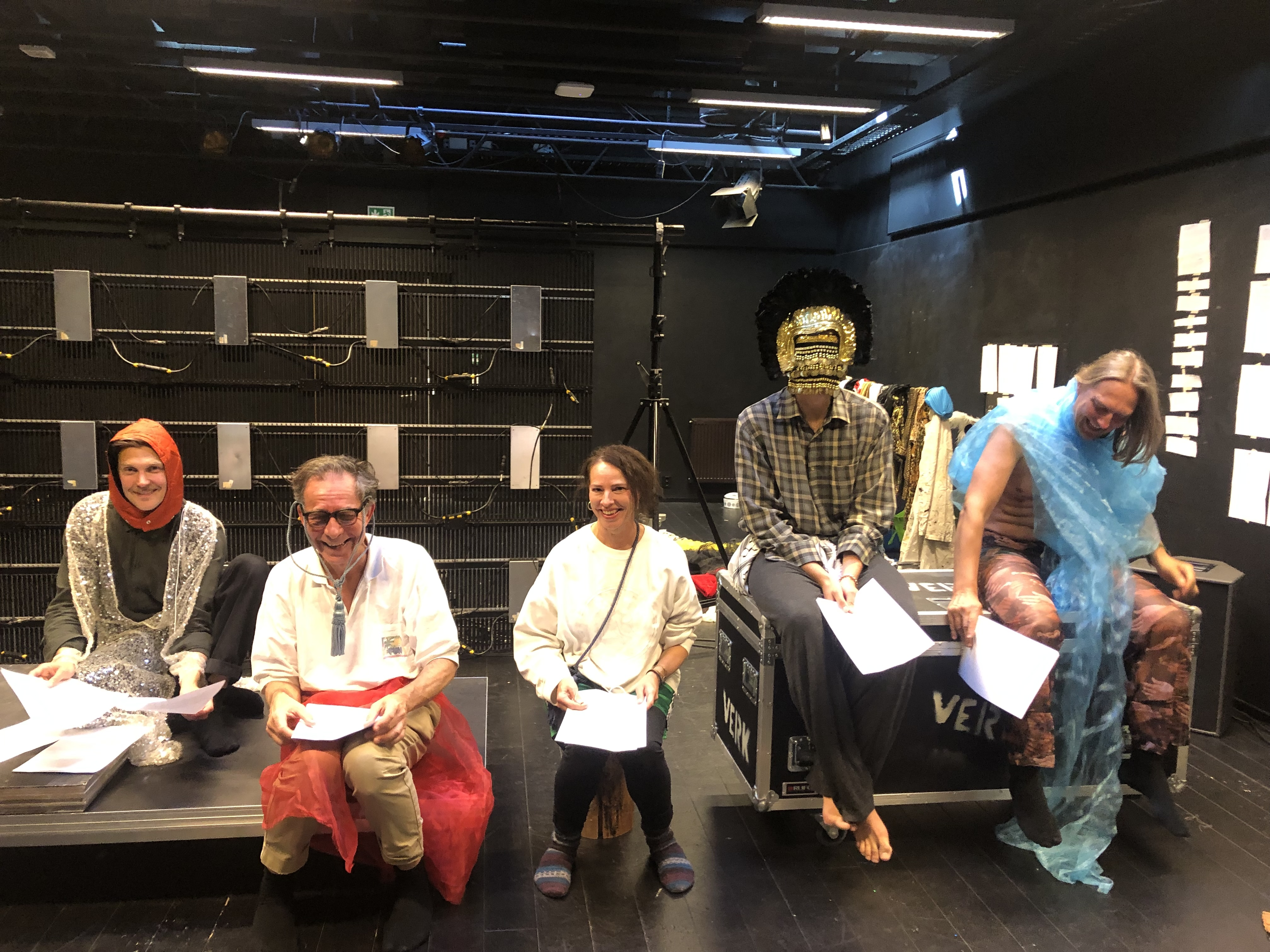 Our theater is also a political expression, even though the expression itself cannot be described as a stated statement, or in a program declaration; the political perhaps lies in the insistence on holding on to that which is ineffable (undescribable), holding on to that which can sometimes be experienced even more real than reality. Something along those lines. Around two o’clock we conclude our joint day, and once again the script team sits down and tries to find texts that can express something about the things we care about—how to express without being too preachy, too specific, too wordy, hinting, issuing commandments, shaping without using power, perhaps pondering, sparking wonder, giving room for personal interpretation, giving the feeling of finding one’s inner story, or one’s own logic that can say something about being human in the world.