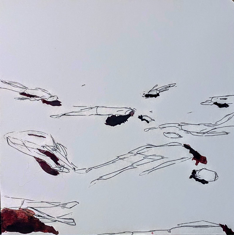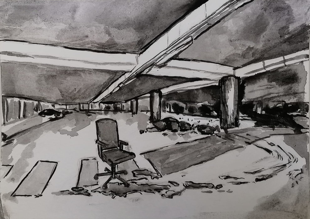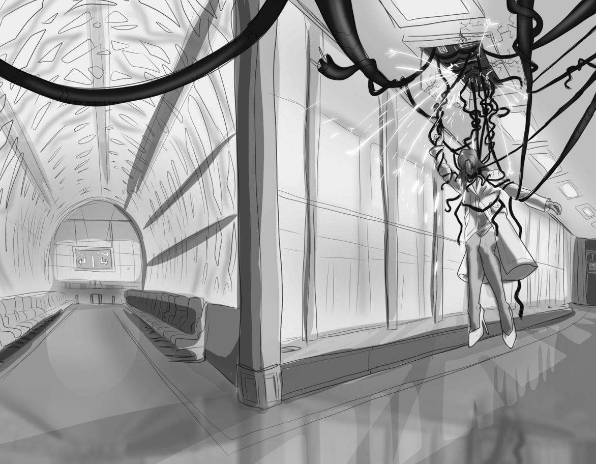 Ik zit het OV, in de trein, alles is in zwart wit, maar niet zwart-wit-camera-filter maar echt zwart-wit. Het was mogelijk heel erg stil in de trein, misschien wat stille muziek, iets verder in de coupee. Ook in deze witte trein met zwarte details hebben ze een scherm waarop dingen worden getoond, de reis updates en berichten. Er komen berichten langs van ´medereizigers´ in het Engels (en ook in het Nederlands volgens mij): 'CONDOLENCE TO MRS ZERO' of 'condolence to the family of miss 0'. Ik zat in een vierzitter en keek naar het bord, tot mijn bestemming er was. Ik stond op, ik kan mij de weg van mijn stoel naar buiten de trein niet herinneren maar alles wat ik zag waren 4 mannen met stakke lange zwarte jassen (uniformen) die aan het springen waren om een vrouw uit de electrische draden te halen. De draden zaten met veel rond haar nek gewikkeld. Zij was in het wit gekleed, ze had haar ogen dicht. Ze hing in een hoek van het station met muren van wit en glas om haar haar heen. Het was al te laat. Haar benen bungelde en draden dansen om haar heen.