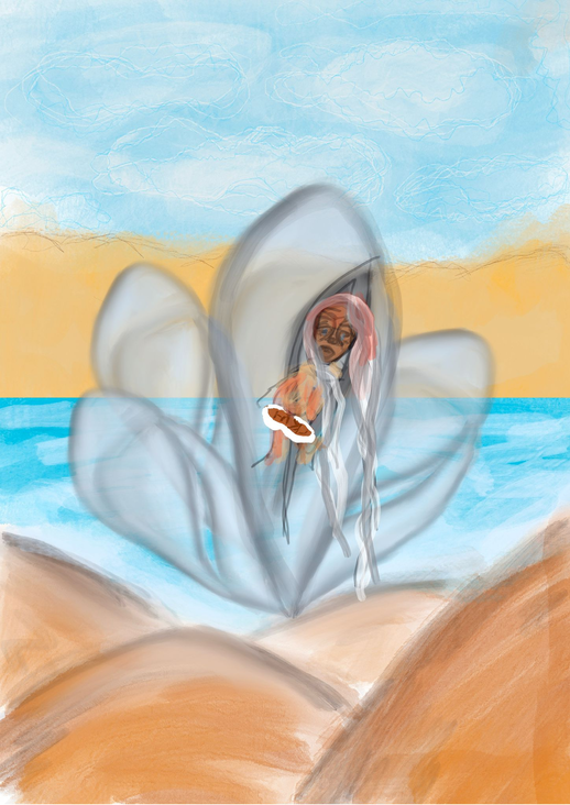 En ik ben dan de actieve versie van mezelf althans vanaf die persoon ervaar ik het mee. En de andere versie van mezelf is in foetus houding op de grond en dan is er iets van een soort ijzeren spies of iets.
