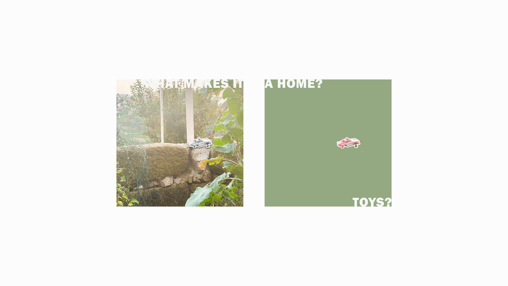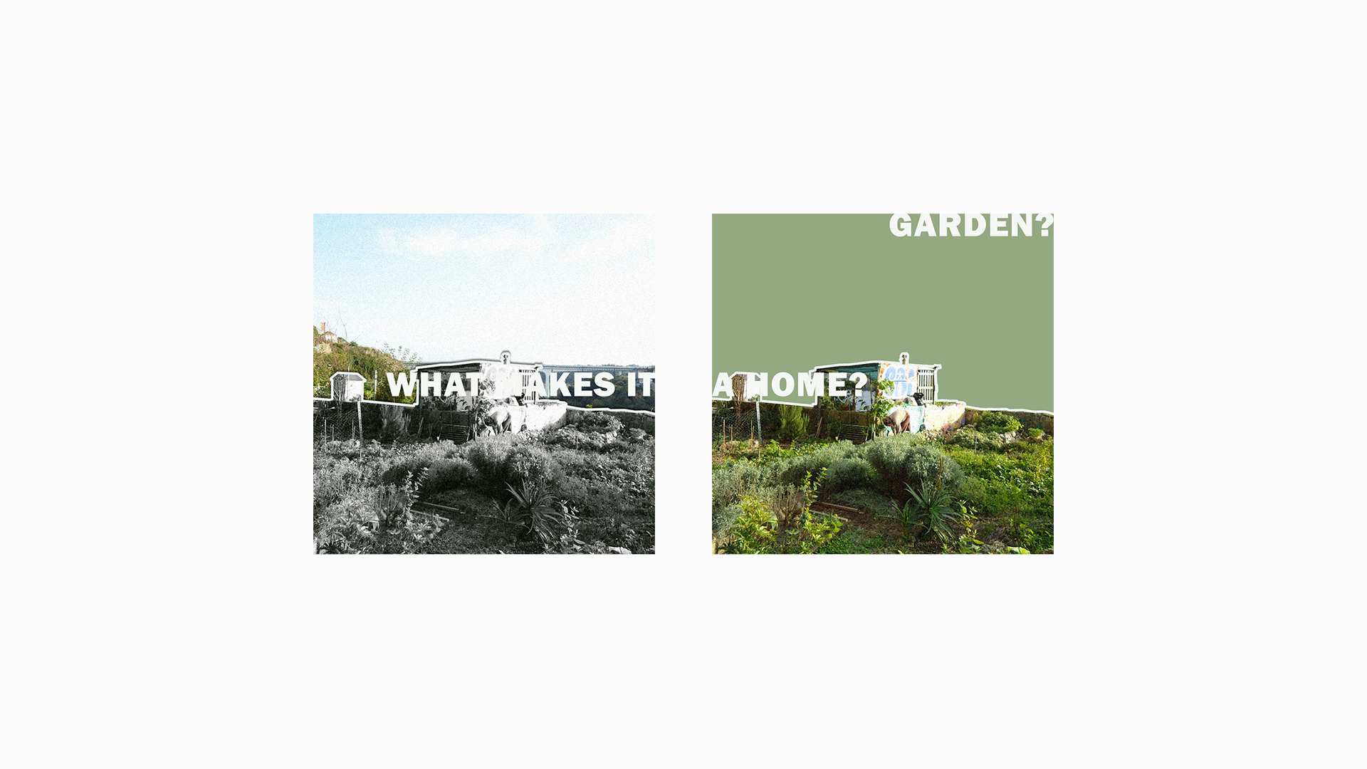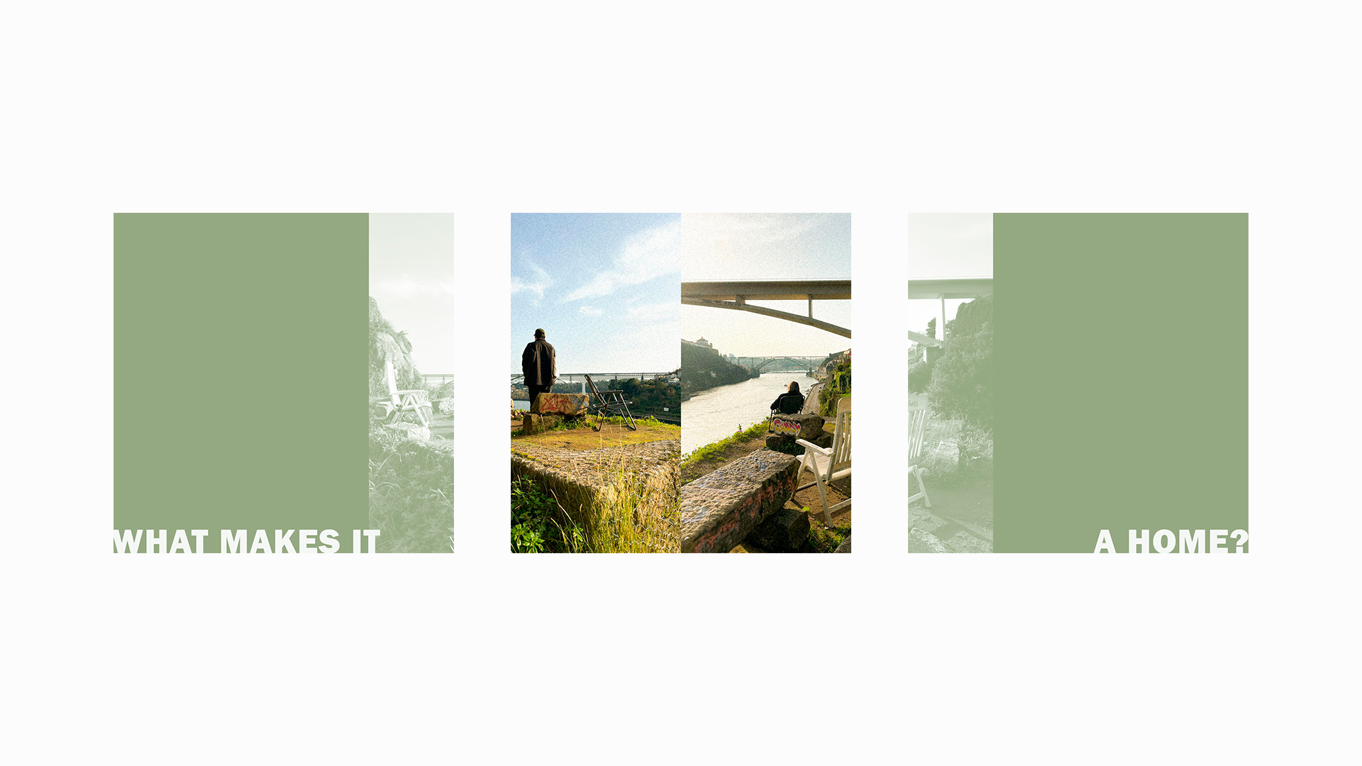 "What makes it a home?" is a question raised during a visit to an occupied space in Fontainhas, Porto (Portugal), where people have practiced urban agriculture and also kept a living space — most of these people are imigrants, far away from their original home and with no affordable place to live in a new country. Observing their space, although a precarious or a transitory way of living, it's possible to notice the human traces between the ruins and vegetation, as well as the care that's put into it. Which brings into reflection, can you bring the "home feeling" to any place, and what can carry this feeling: people, decorations, furniture, toys; or, maybe, it's simply the sentiment of care or of identity.