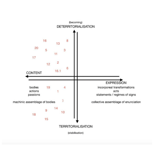 “On a first, horizontal, axis, an assemblage comprises two segments, one of content, the other of expression. (....) Then on a vertical axis, the assemblage has both territorial sides, or reterritorialized sides, which stabilize it, and cutting edges of deterritorialization, which carry it away.” 1