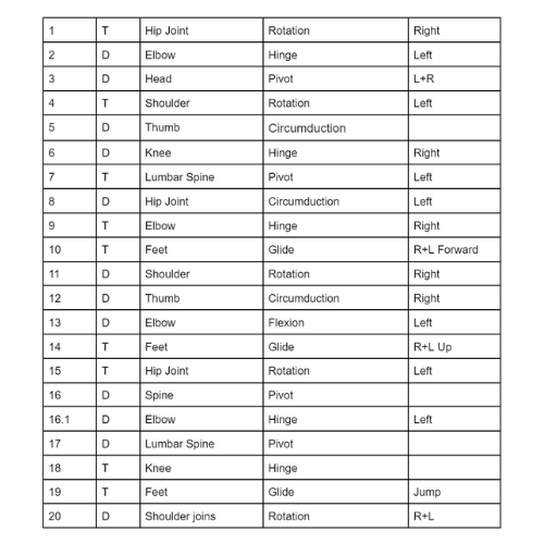 The score included five types of movement: rotation, hinge, pivot, glide and circumduction. In the next step the order and the body parts were defined, while the direction and speed remained open.It is clear that such a score is a figure of thought rather than a realistic organisational order. To start with, a mobilization of such joints is not possible in isolation, secondly the movement is not defined in time and space, leaving it open to a possibility and each of the reactions produces additional movement that exist simultaneously to the score.
