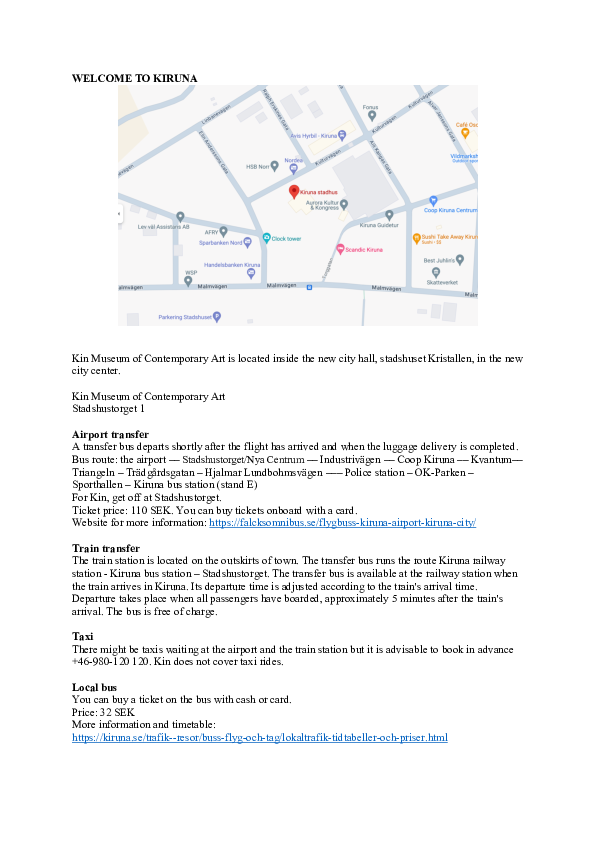General information about Kiruna and how to get to Kin Museum of Contemporary art can be found in the PDF.