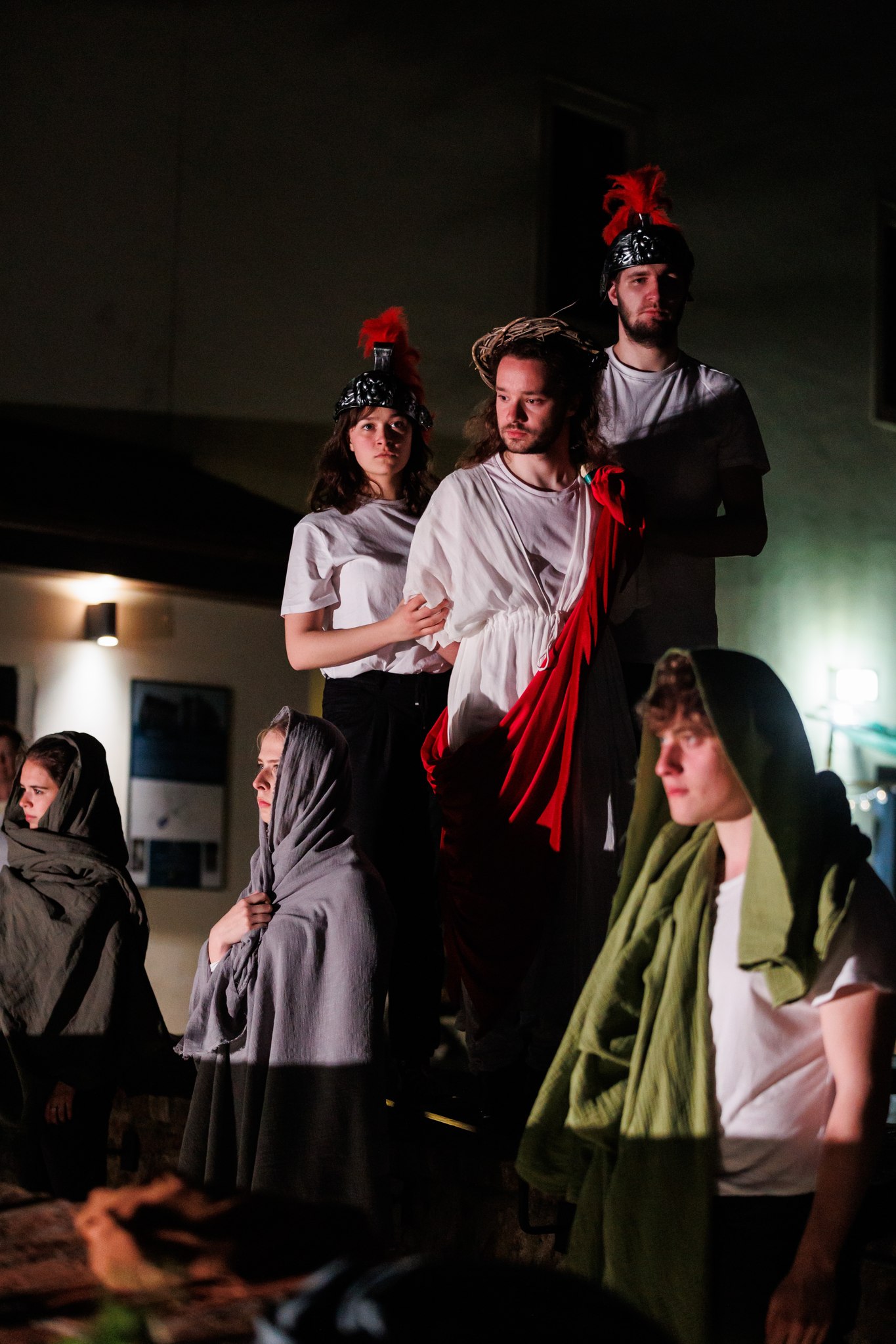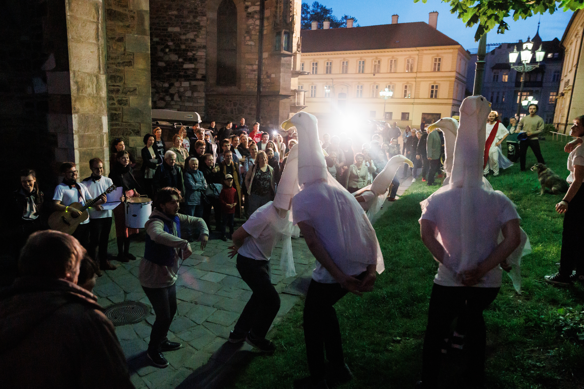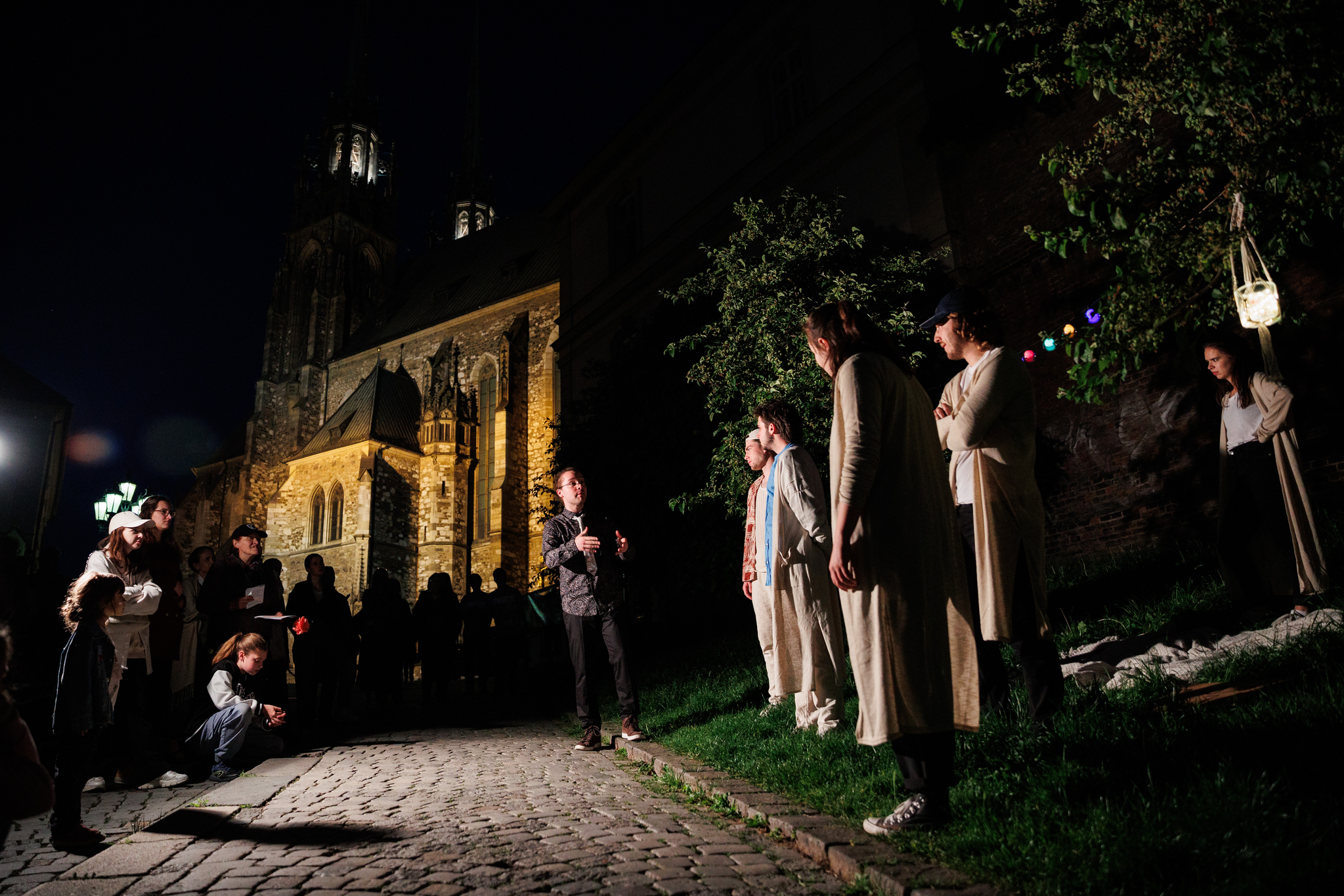 Historickými řešeními, ale i principy popsanými v knize Petera Scherhaufera Takzvané pouliční divadlo (Scherhaufer 2002) a vlastními zkušenostmi jsme se řídili při výběru a následném zkoušení inscenace Truchlivá veselohra o světci Petru ve specifickém prostoru Petrova. Většinu scén jsme se snažili situovat do vyvýšeného prostoru, který byl ohraničený obrubníkem, zábradlím nebo jiným typem determinační čáry oddělující hrací prostor od diváckého. Pokud nebylo možné hrát na vyvýšeném místě, snažili jsme se zvolit široký prostor, aby se v něm diváci mohli co nejvíce rozprostřít, a zanikly tak zadní řady, kde je špatná viditelnost. Pokud jsme měli obavy ohledně viditelnosti některých důležitých akcí nebo postav (například ležícího pacholka na lavičce), doplnili jsme je do textu Opovědníka, aby zadní řady nepřehlédly žádný důležitý moment, který by narušil jejich zážitek z divadla.