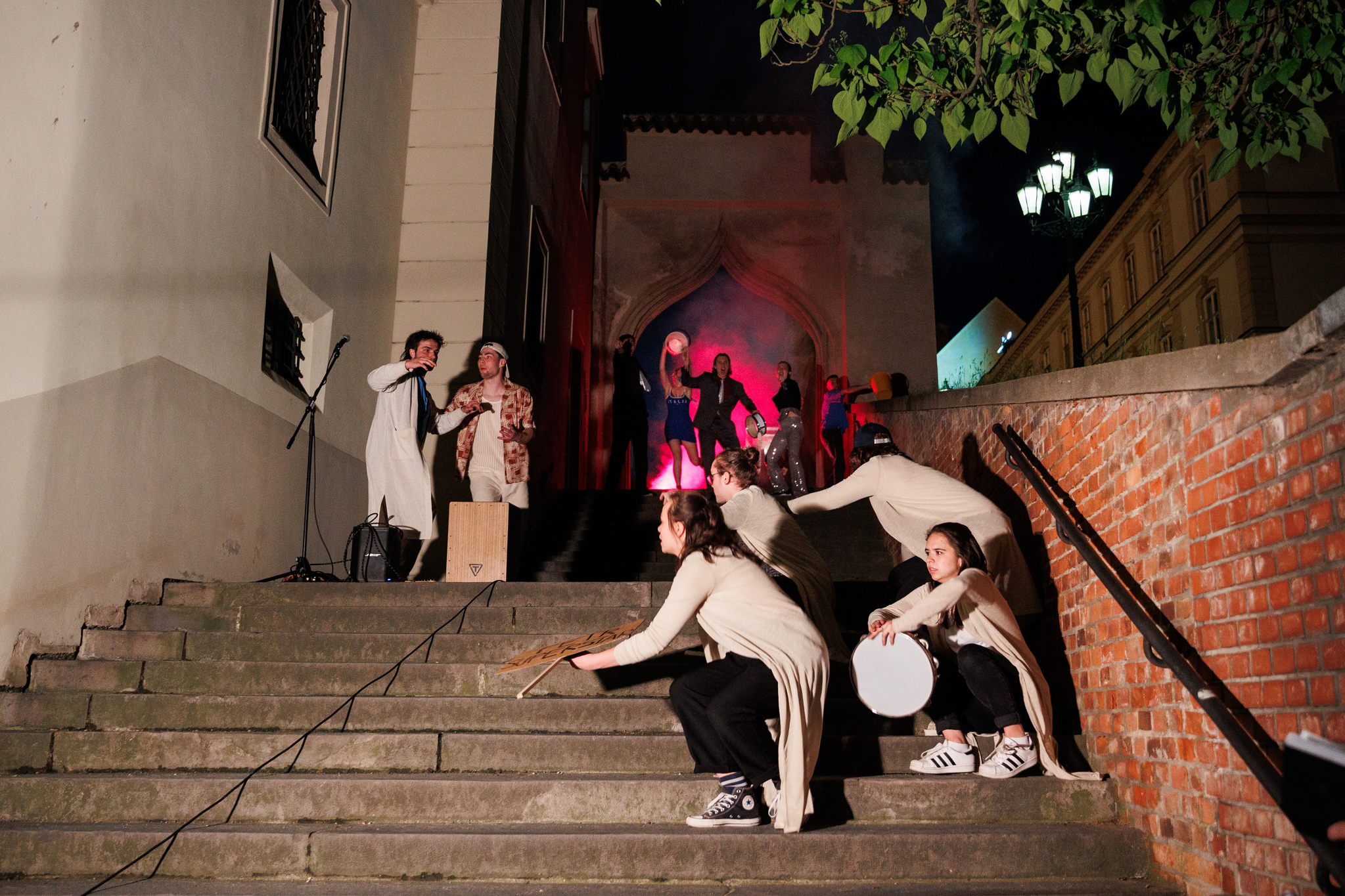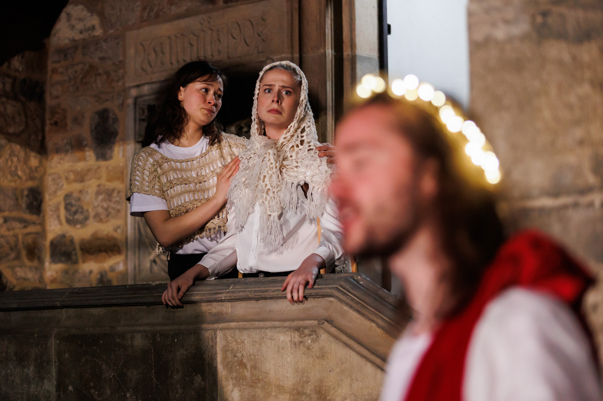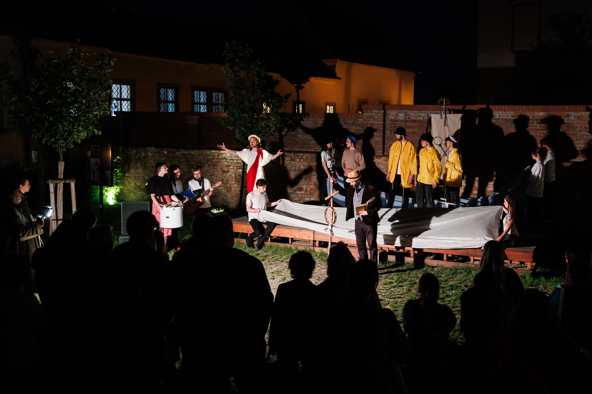 Historickými řešeními, ale i principy popsanými v knize Petera Scherhaufera Takzvané pouliční divadlo (Scherhaufer 2002) a vlastními zkušenostmi jsme se řídili při výběru a následném zkoušení inscenace Truchlivá veselohra o světci Petru ve specifickém prostoru Petrova. Většinu scén jsme se snažili situovat do vyvýšeného prostoru, který byl ohraničený obrubníkem, zábradlím nebo jiným typem determinační čáry oddělující hrací prostor od diváckého. Pokud nebylo možné hrát na vyvýšeném místě, snažili jsme se zvolit široký prostor, aby se v něm diváci mohli co nejvíce rozprostřít, a zanikly tak zadní řady, kde je špatná viditelnost. Pokud jsme měli obavy ohledně viditelnosti některých důležitých akcí nebo postav (například ležícího pacholka na lavičce), doplnili jsme je do textu Opovědníka, aby zadní řady nepřehlédly žádný důležitý moment, který by narušil jejich zážitek z divadla.