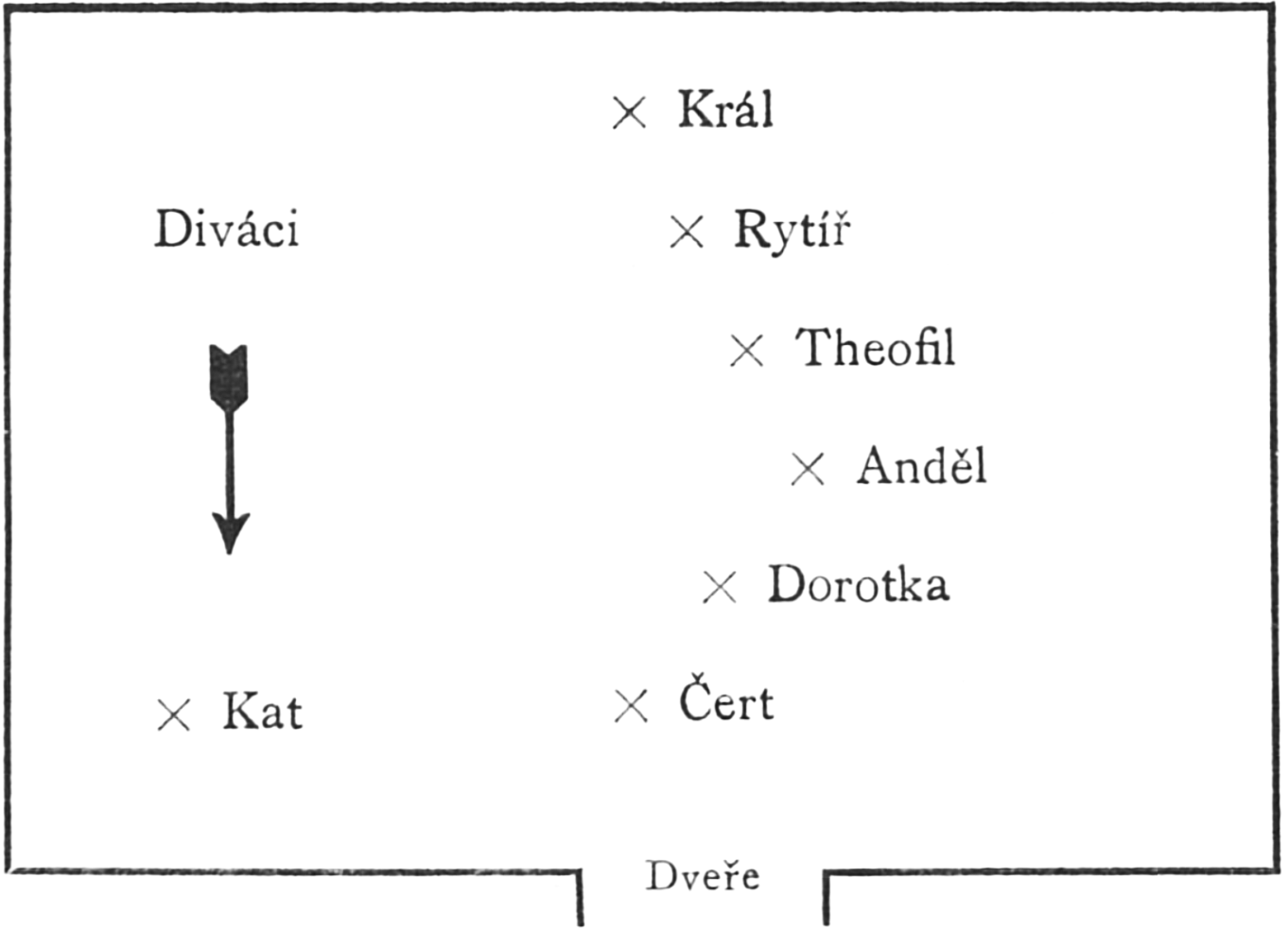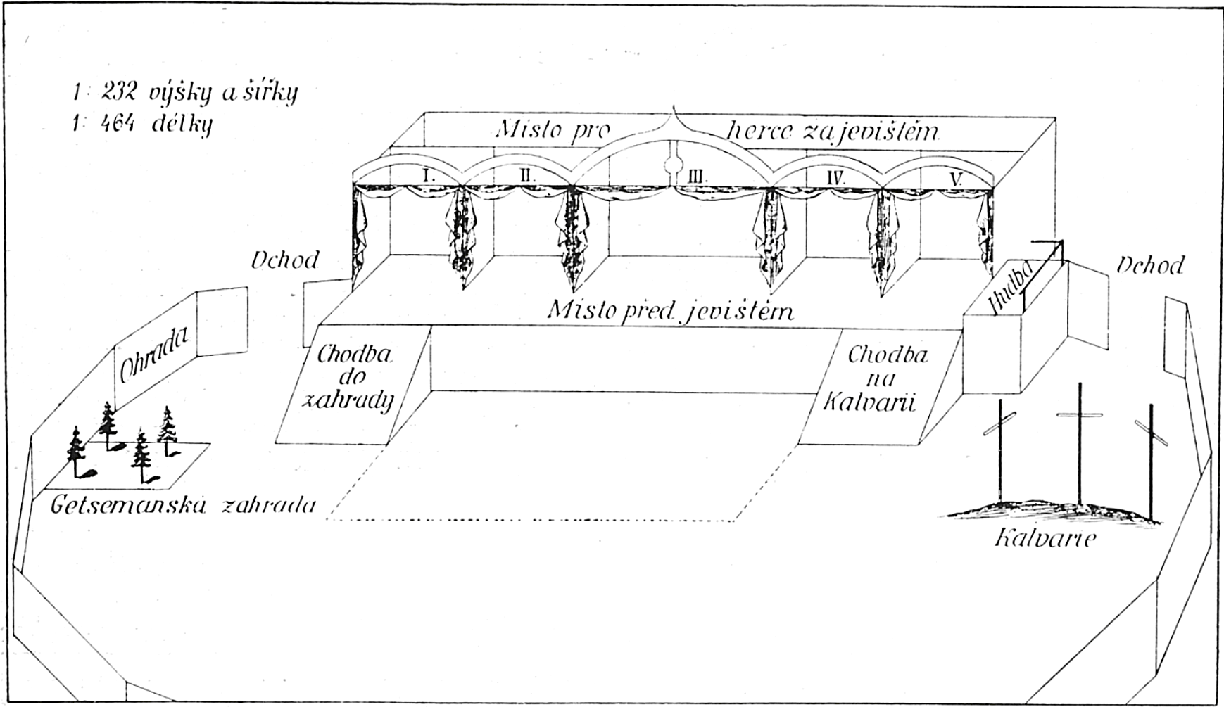 Zastavme se také chvíli u práce s prostorem. Vzhledem k šířce fenoménu, který označujeme „českým lidovým divadlem“, je právě prostor nejkomplikovanější pro zobecnění do principu. Na jedné straně najdeme minimalistické inscenační tvary pochůzkového divadla, které se hrálo ve světnici, jako je například Štěpánem Dvořákem popsaná Hra o svaté Dorotě z Milevska (Bogatyrev 1940). Na druhé straně velkolepé hry s velkým počtem herců, pro která se stavěla na volném prostranství jeviště s jednoduchými dekoracemi nebo oponami, např. vánoční hra Bozkovská (Černý 1968). A mezi těmito dvěma přístupy najdeme ještě množství dalších variací, jako bylo hraní před stavením, později v selských dvorech byla stavěna jednoduchá jeviště, hrálo se na návsi nebo před kostelem, kde zase scénografii tvořila zejména pevná architektura v okolí. Pro nás je ale zásadní, že i přes různorodý přístup k hracímu prostoru si lidové divadlo zachovává tendenci k pouhé výrazové náznakovosti. Zejména je to patrné u pochůzkových her hraných v malých místnostech vesnických chalup, ale i velké a nákladné produkce jednotlivá místa pouze naznačují jednoduchými prostředky.