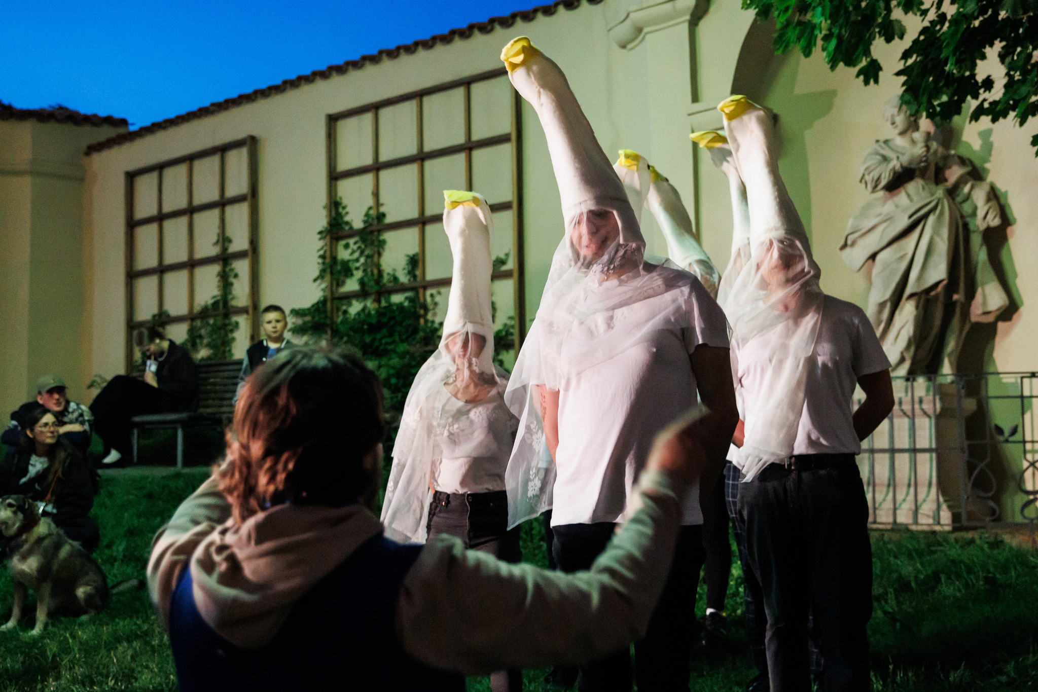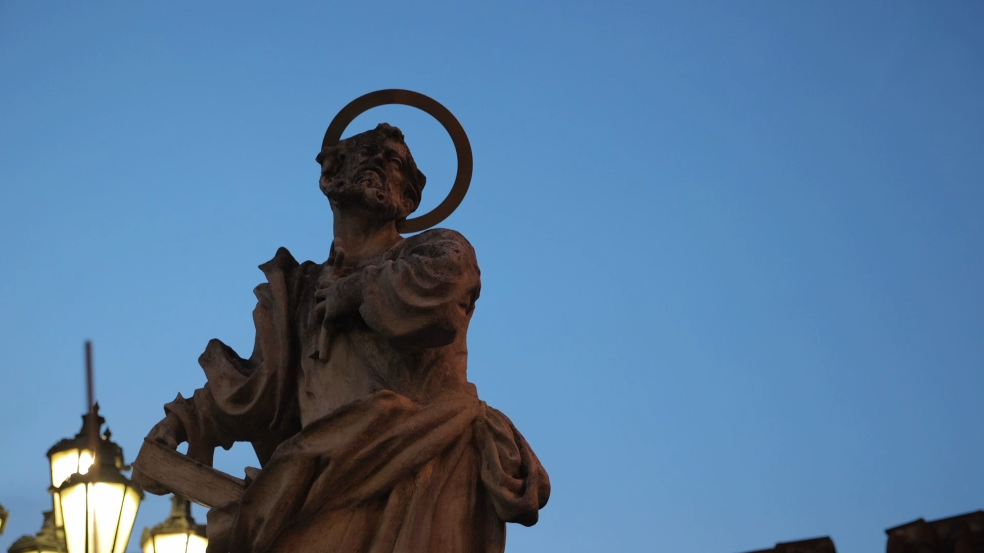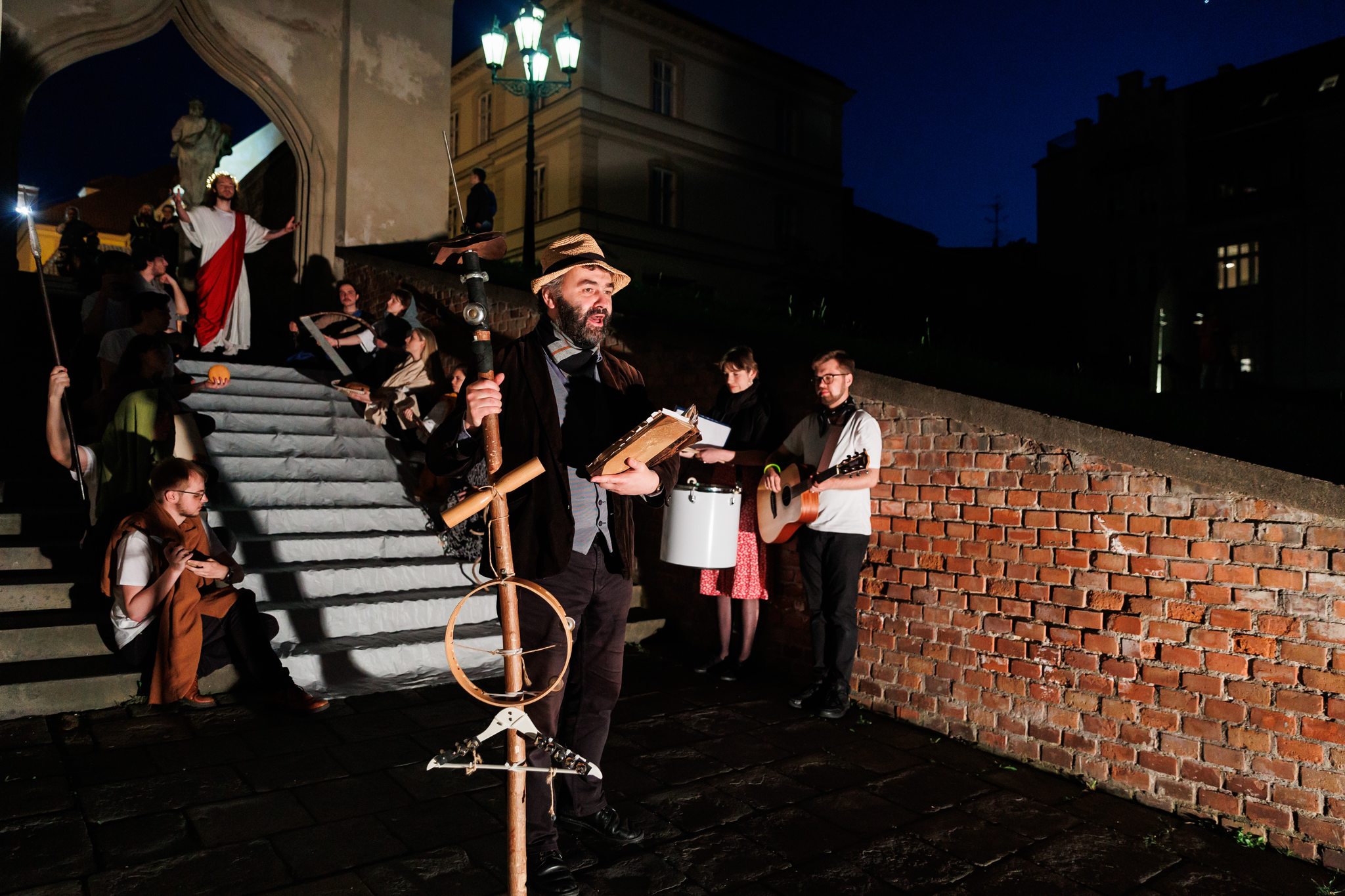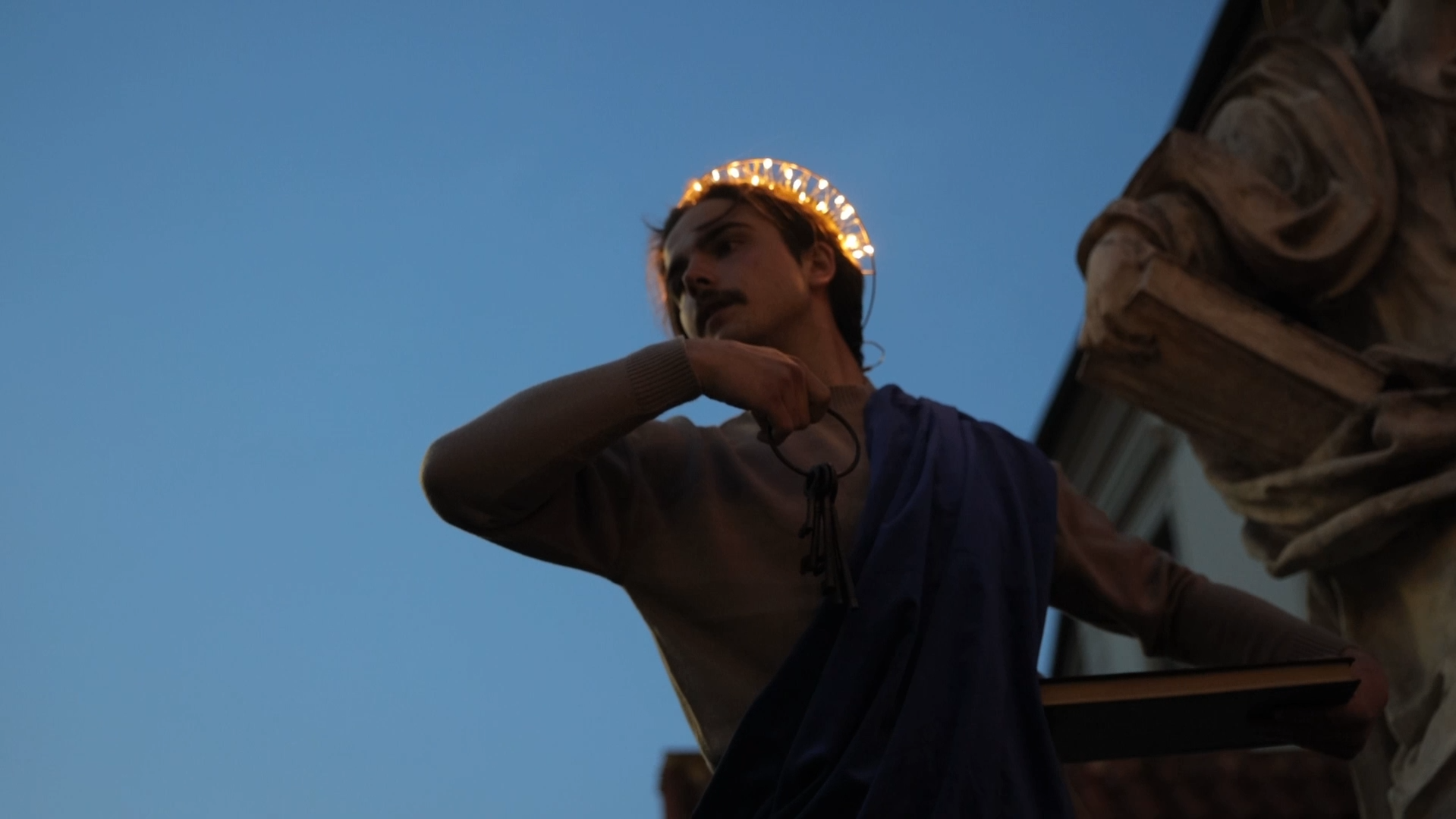 V první inscenaci Truchlivá veselohra o světci Petru, která se režijním pojetím snažila napodobit principy lidového divadla 17. století, se proto nachází v liturgických pasážích inscenace scénické obrazy inspirované náboženskou ikonografií, například hned v úvodním scénickém obraze inscenace, kdy herec vytváří přesnou nápodobu sochy svatého Petra, nebo jde o inspiraci obrazy různých malířů znázorňujících obraz poslední večeře Páně.