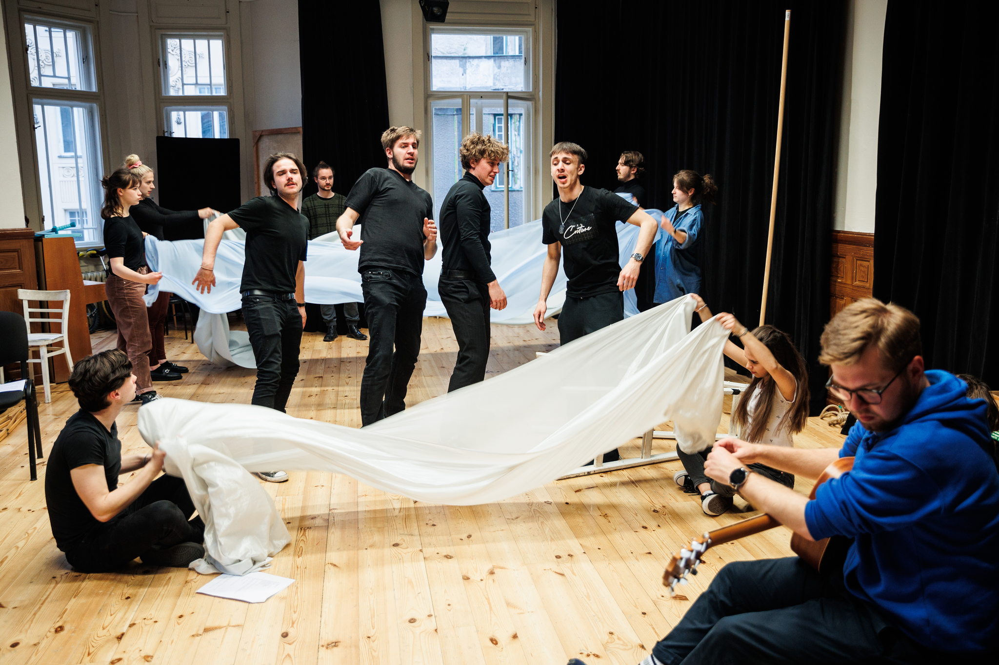 Při objevování jednoduché práce s efekty po vzoru lidového divadla jsme se dostali k otázce jejich vnímání současným a historickým divákem. Například v inscenaci Truchlivá veselohra o světci Petru jsme se pokoušeli rekonstruovat lidovou verzi efektu znázorňujícího rozbouřené moře. Zatímco u dvorského divadla se používal rotační válec s pomalovaným plátem podpořený zvukovými efekty tvořenými divadelními stroji, u lidového divadla se mohly používat místo válce jednoduše látky rozvlněné herci za doprovodu bubnu.
