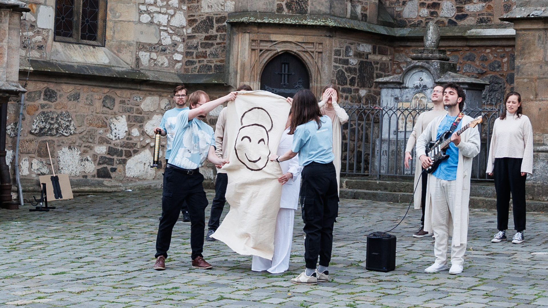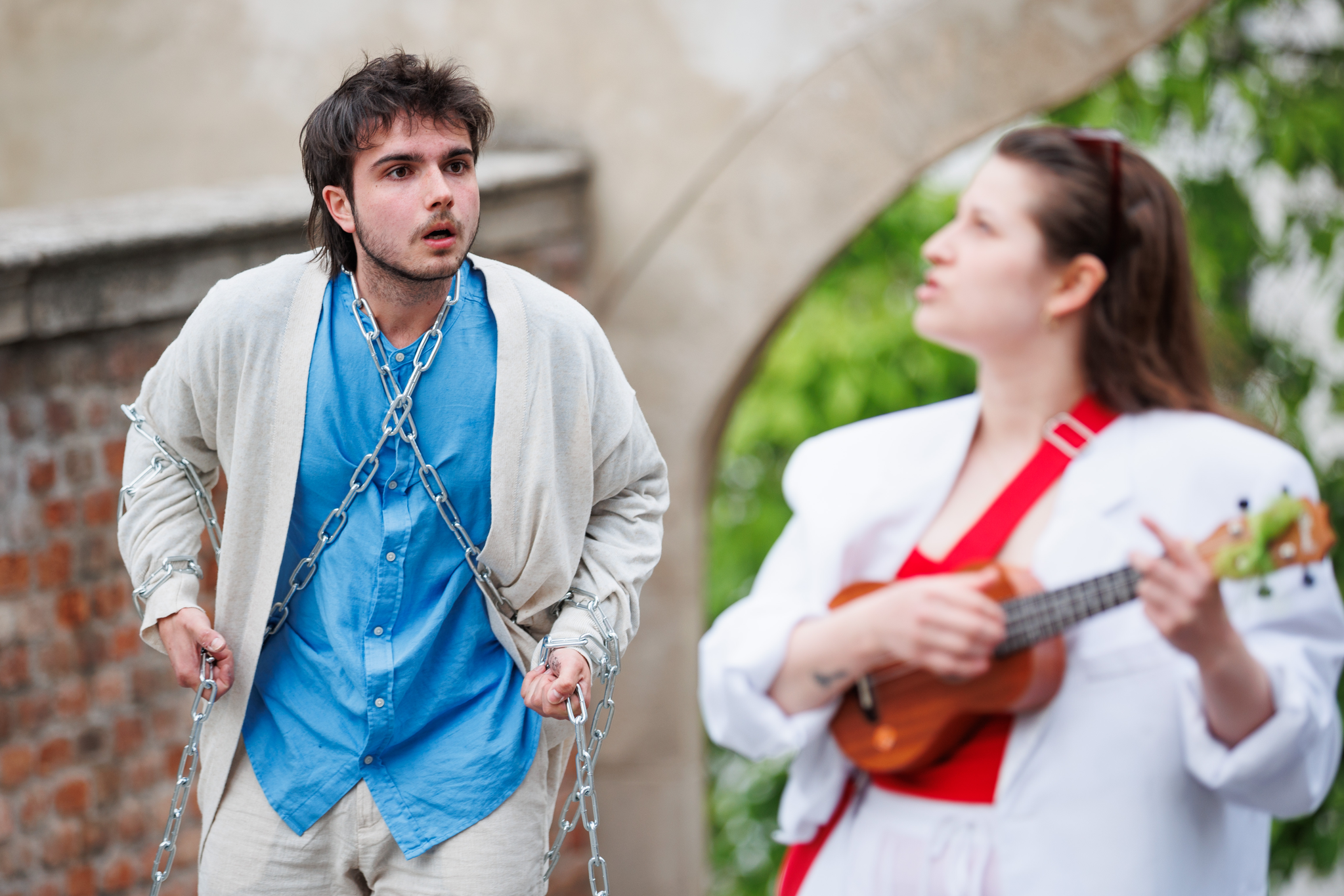 V obou inscenacích jsme použili princip multifunkčního využití běžně dostupných rekvizit a jejich metaforičnosti typické pro lidové divadlo, jako byly například žebřík, vlajka, látky nebo řetězy.
