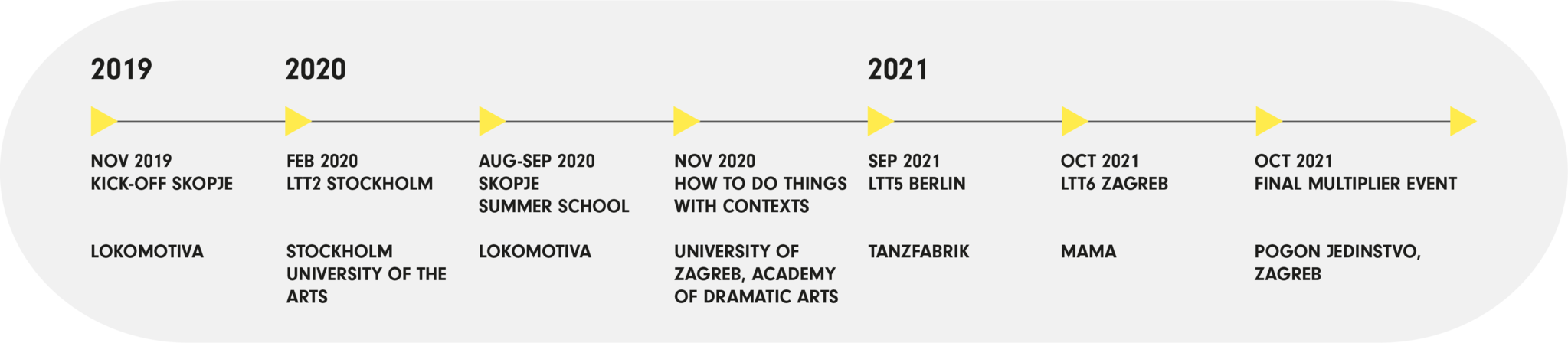 The consortium of Curating in Context consists of the NGOs Tanzfabrik Berlin and Lokomotiva, Skopje, as well as the Higher Education Institutions Stockholm University of the Arts and University of Zagreb.