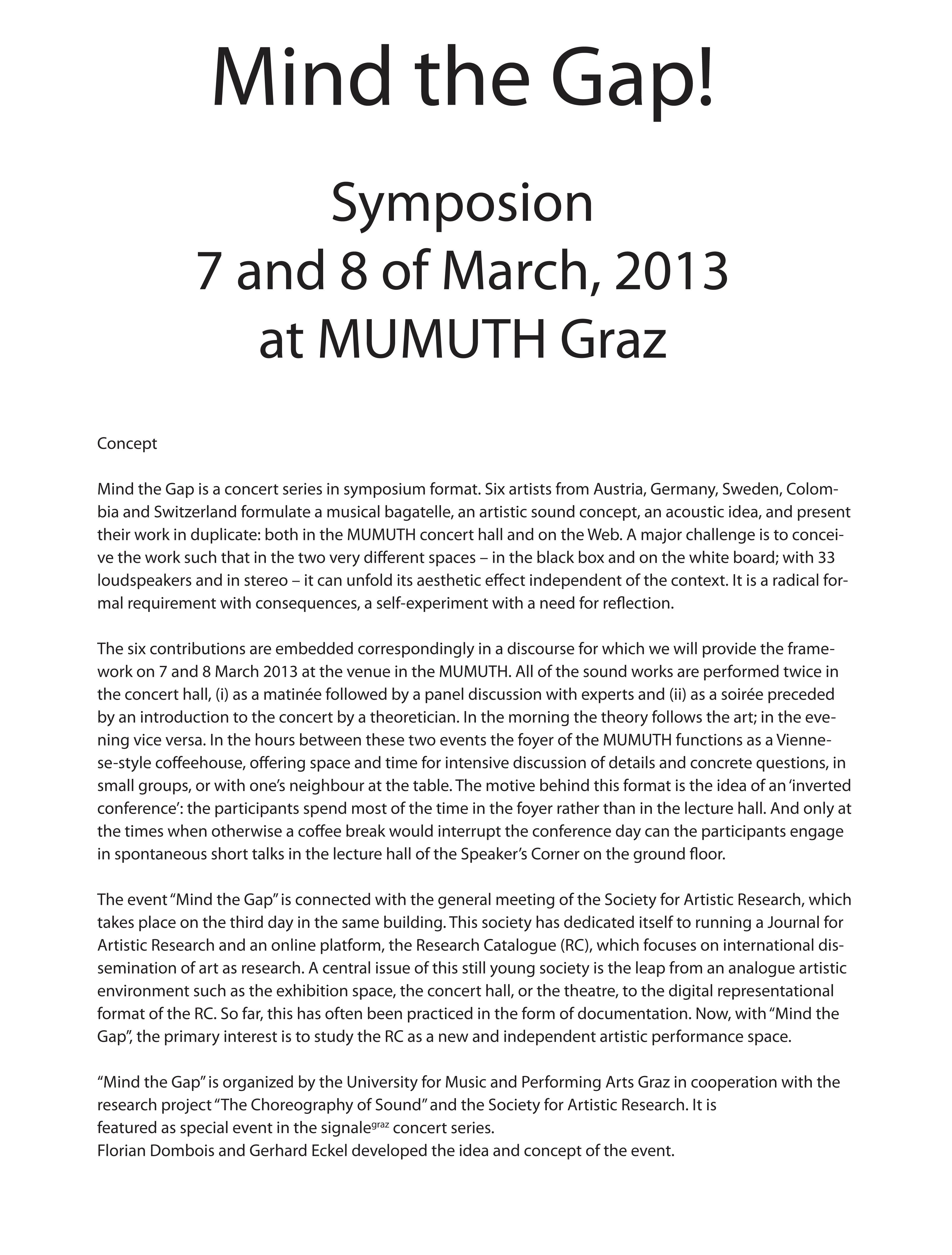 "Mind the Gap" is a concert series in symposium format. Six artists from Austria, Germany, Sweden, Colombia and Switzerland formulate a musical bagatelle, an artistic sound concept, an acoustic idea, and present their work in duplicate: both in the MUMUTH concert hall and on the Web. A major challenge is to conceive the work such that in the two very different spaces – in the black box and on the white board; with 33 loudspeakers and in stereo – it can unfold its aesthetic effect independent of the context. It is a radical formal requirement with consequences, a self-experiment with a need for reflection.