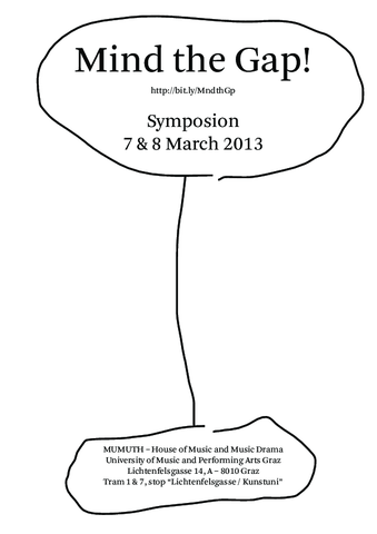 "Mind the Gap" is a concert series in symposium format. Six artists from Austria, Germany, Sweden, Colombia and Switzerland formulate a musical bagatelle, an artistic sound concept, an acoustic idea, and present their work in duplicate: both in the MUMUTH concert hall and on the Web. A major challenge is to conceive the work such that in the two very different spaces – in the black box and on the white board; with 33 loudspeakers and in stereo – it can unfold its aesthetic effect independent of the context. It is a radical formal requirement with consequences, a self-experiment with a need for reflection.