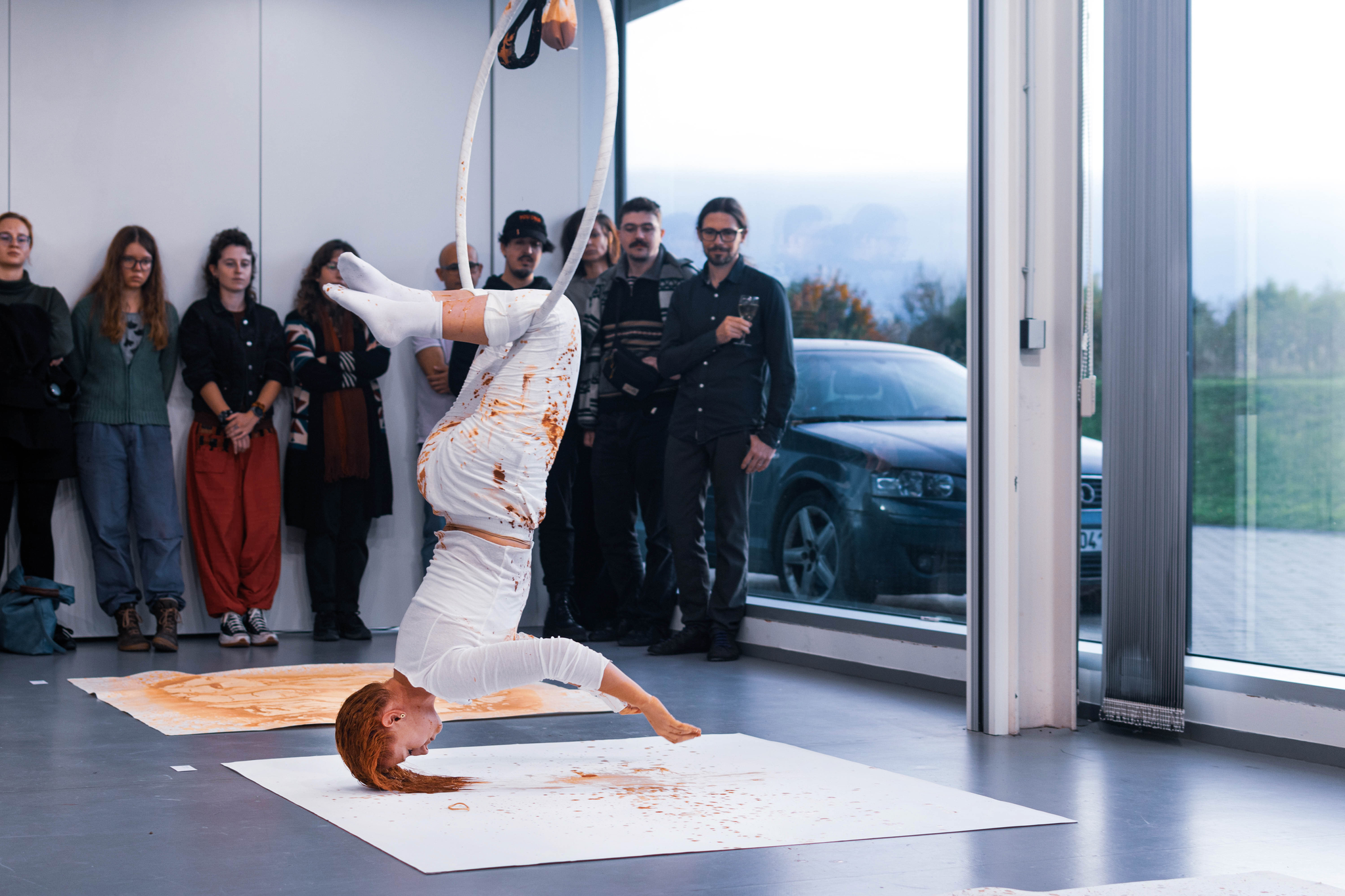 In addition to action painting and acrobatics, this project also combines elements of improvisation, which brings elements of the unexpected to each performance. It is the unplanned moments and the body’s reactions to the situation that constitute an important element of the overall composition. When the artist moves in the air, when his body hovers above the painting surface, each movement is a record of an immediate experience and at the same time a creative act. This spontaneity enriches the entire process with new dimensions that can never be precisely planned or controlled.