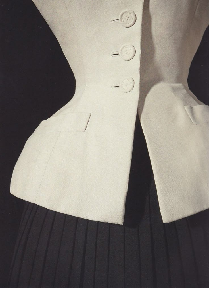 Lots of dresses going until the knees: arms and legs are cover. There were silhouettes with snatch at the waist for the most of them: Iconic Bar jacket