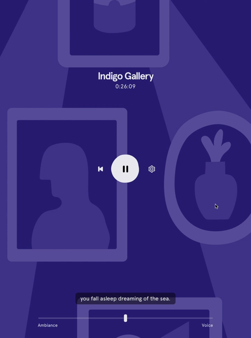 Headspace je anglo-americká společnost specializující se na duševní zdraví. Působí především prostřednictvím své stejnojmenné online platformy, která se zaměřuje zejména na výuku mindfulness technik a řízenou meditaci. Vedle toho představila ale také sleepcasty – zvukový obsah určený speciálně k vytvoření vhodných podmínek pro snazší usínání. Ve sleepcastech absentuje jakýkoliv děj a jsou to vlastně čisté popisy různých míst doplněné o meditační techniky, dechová cvičení a ambientní zvukovou stopu. V množství prostředí, jako jsou antikvariát za deštivého dne, půlnoční prádelna s předoucí kočkou nebo táborák v noční poušti, se objevuje například i galerie. Konkrétně galerie Indigo, která je pro nás zajímavá tím, že prostředkem k postupnému zklidnění naší neutěšené mysli jsou zde ekfráze, tedy popisy imaginárních uměleckých děl nejrůznějšího druhu, které jsou v Indigo Gallery rozesety všude kolem nás.
