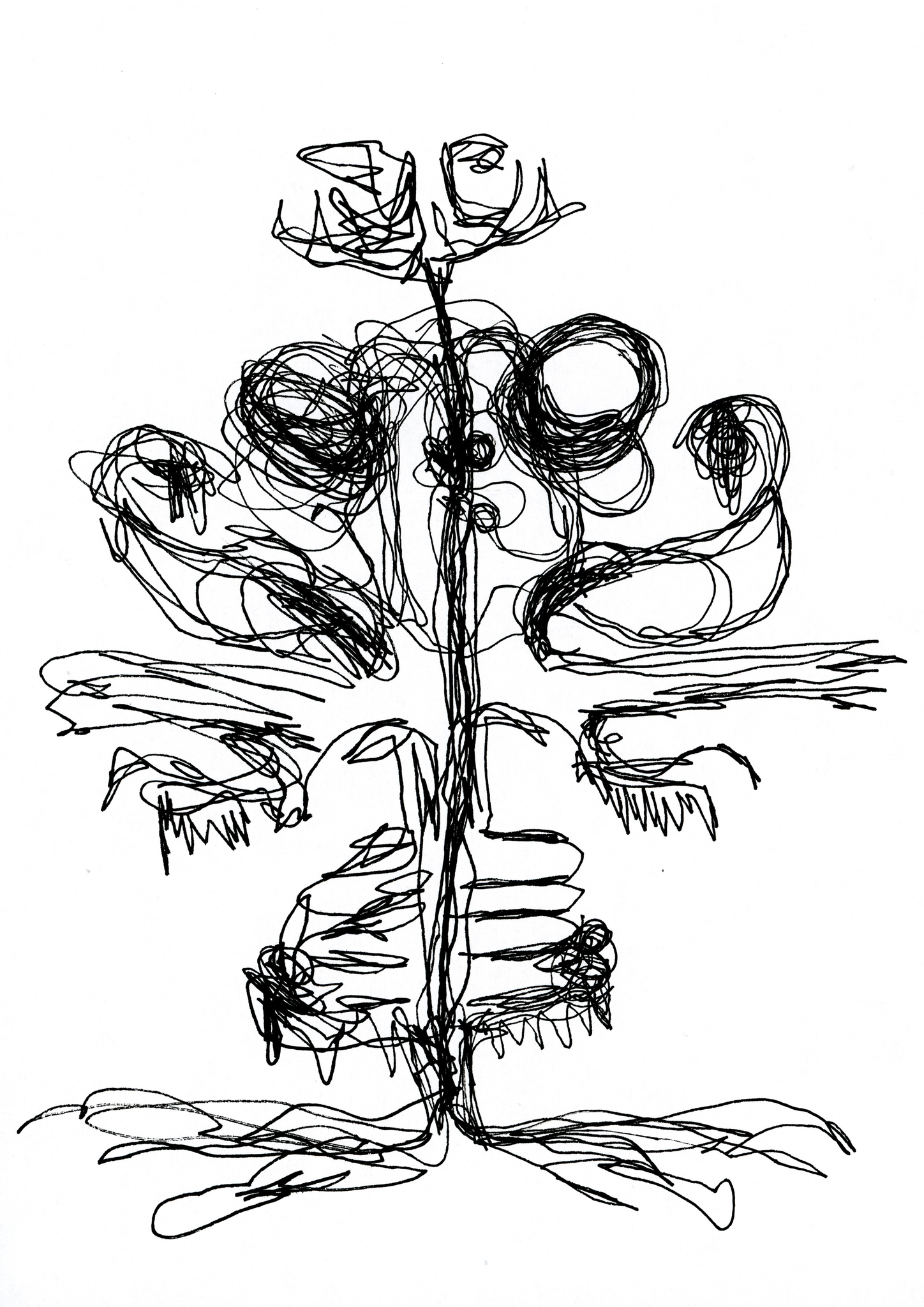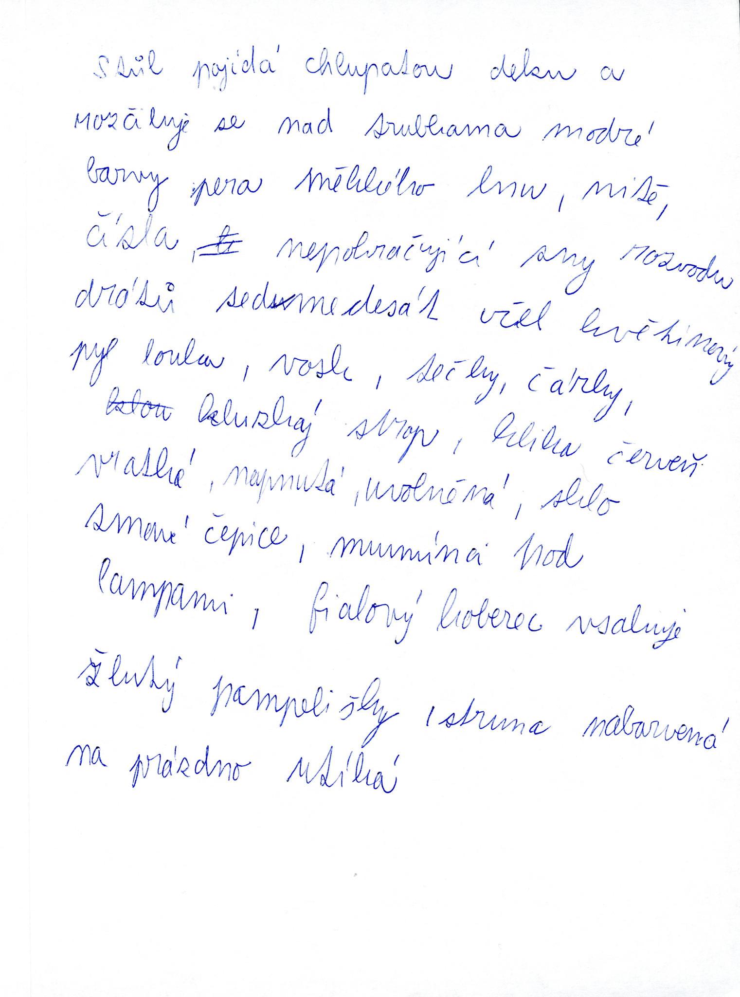 Stůl pojídá chlupatou deku a rozčiluje se nad trubkama modré barvy pera měkkého lnu, nitě, čísla, nepokračující sny rozvodu drátů sedmdesát včel květinový pyl louka, vosk, tečky, čárky, kluzký strop, klika červeň vratké, napnutá, uvolněná, sklo tmavé čepice, mumína pod lampami, fialový koberec vsakuje žlutý pampelišky, struna nabarvená na prázdno utíká