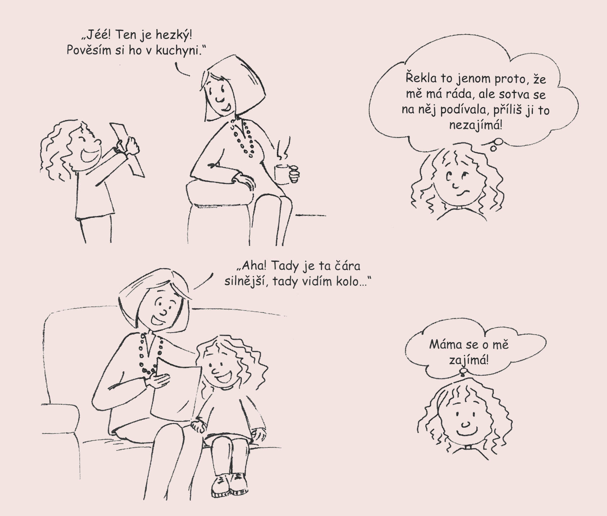 Martin Jára: Ale všimněte si, když teď popíšu to, co vidím na tom nákresu, tak tady v tom prvním případě ukazuje holčička mamince ten obrázek. A ten obrázek je mezi ní a maminkou. Všimněte si jejich těl. Tady na tom druhém obrázku se společně dívají na ten obrázek a sedí vedle sebe a dotýkají se.