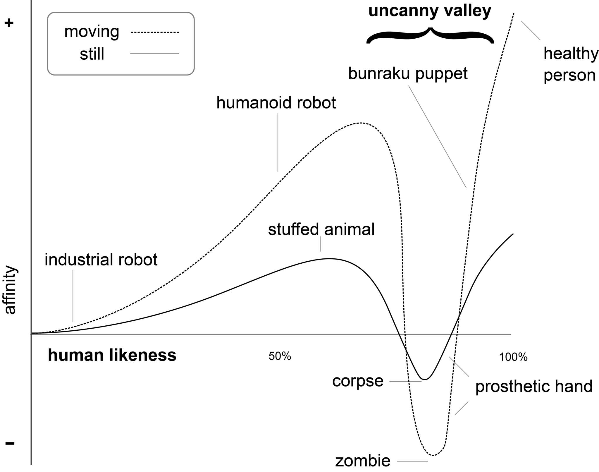 Faktem je, že jsem si na používání některých nástrojů AI velmi rychle zvykl. Euforii vystřídala samozřejmost, se kterou už nahrávky rozhovorů, které potřebuji přepsat do písemné podoby, nezasílám paní Pavle Skalické z Rokytnice v Orlických horách jako dřív, ale přepisuje mi je software založený na strojovém učení. Pocit znepokojení ale tak úplně nevyprchal. Vlastně by se dal připodobnit pocitu tzv. tísnivého údolí (angl. uncanny valley1). Ten podle profesora robotiky Masahiro Moriho nastává, když pozorujeme s menším či větším pocitem nevolnosti přílišné prolnutí robotického s lidským – např. při interakci s humanoidním robotem. To, s čím interagujeme, sice prozatím antropomorfní podobu nemá. Člověku se ale blíží tím, že ho imituje skrze generované texty, zvuky, obrazy, videa a bůhví co ještě. Tíseň přichází, jakmile stroj začne příliš připomínat člověka – nebo, jako v tomto případě, jeho výtvory.