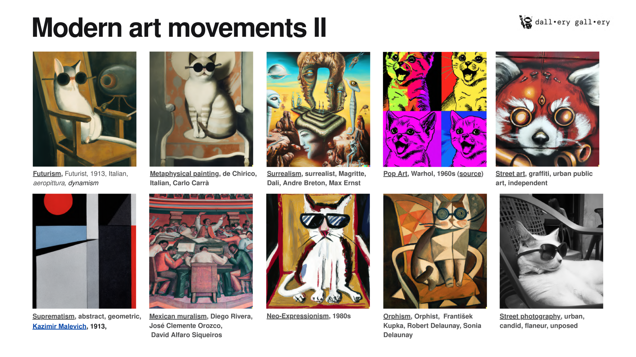 Toto jsou názvy některých příruček, které si můžete stáhnout na webu a v nichž uživatelé sdílejí strategie, jak napsat prompty, aby výsledek co nejvíce odpovídal představě uživatele, případně ji předčil. Jejich autoři nás navádějí k tomu, abychom stroji specifikovali svůj požadavek například tzv. modifikátory, tedy abychom určili, jak má být scéna či objekt nasvícen, v jakém prostředí se má nacházet, jaké barevné schéma, ohnisko objektivu či úhel pohledu apod. mají být použity. Výsledek markantně ovlivní to, zda se má jednat o kresbu, fotografii, malbu, 3D render nebo další umělecká média. Můžeme specifikovat jakoukoliv výtvarnou techniku, dobu vzniku či emoci. Velmi účinným modifikátorem je, ve stylu jakého umělce má být obraz vygenerován. V prompt bookách, jak se tyto příručky také nazývají, najdeme jména a ukázky prací malířů, fotografů, ilustrátorů, grafických designérů a dalších umělců, o kterých už nemusíme vůbec nic vědět a slouží nám pouze jako reference pro dosažení kýžené vizuality. Stejné je to u uměleckých slohů nebo moderních hnutí. Prompt booky jsou tak ve skutečnosti utilitárně scvrklé a z kontextů vytržené dějiny vizuální kultury, v nichž jména autorů, umělecké styly a výtvarné techniky pozbývají výpovědní hodnotu a provázanost a slouží jen jako vizuální reference.