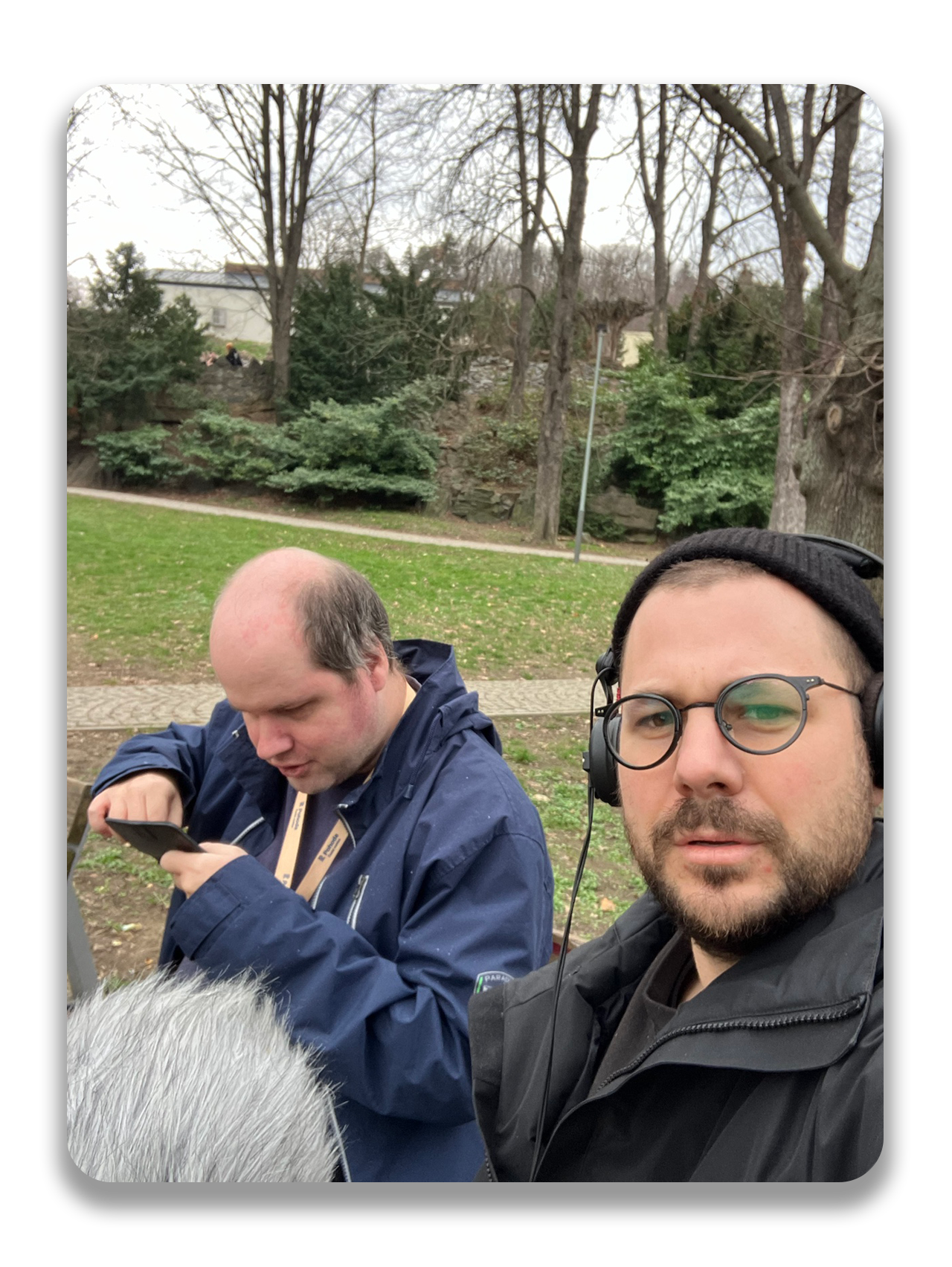 BME: Na fotografii jsou dva muži, jeden z nich vpravo se dívá do kamery a má na sobě černou bundu a černou čepici a nasazena sluchátka. Muž vlevo má na sobě modrou bundu a je zaměřen na mobilní telefon, který drží v rukou. Oba jsou venku v parku s holými stromy a se zeleným trávníkem na pozadí.