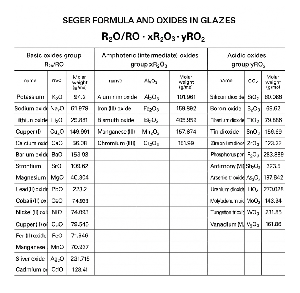 An important tool for creating glazes is Seger’s formula, which includes various chemical components used in glaze production. This formula helps determine the optimal ratio of components to achieve the desired properties of the glaze, such as: