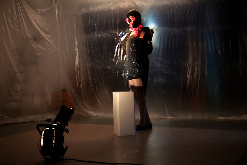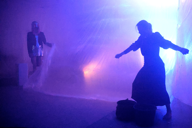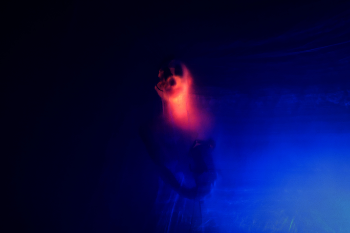 We worked very intuitively. I remember entering the space and seeing the potential to work with thin sheet of plastic. The quality of this material is nice, because it is very delicate and wavy. And the sound is nice because it can crisp like gentle cracking ice. The idea to work with this material resonated with Bas and we started to hang the sheets. The room was divided and we came to some basic narrative idea of going through this wall of plastic, as to move into a different, deeper layer of the subconsciousness. Our approach to finding vertical resonance (resonance with the totality of the world) was through working with the form of a ritual to open up and immerse the audience in the totality of a dreamlike world, through the notion of 'incantation'.