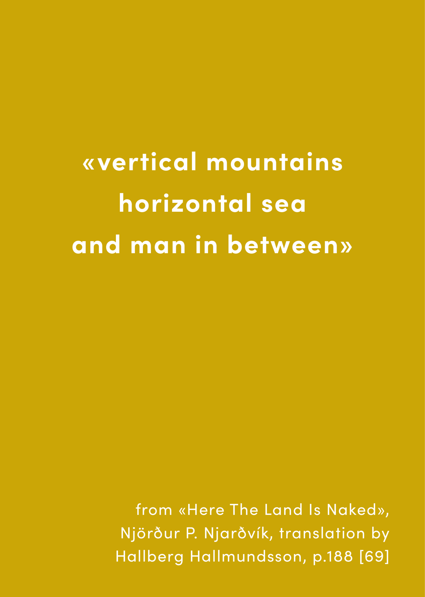 Nature is vast in the Westfjords. For decades, the region has seen its population shrink. Today, it counts 7,200 people in an area half the size of that of Switzerland, a country with 9 million inhabitants. Most human settlements in the Westfjords sit on narrow strips of land in between mountains and fjords as expressed so powerfully by local author Njörður P. Njarðvík in his poem "Here The Land Is Naked". Nature’s vastness can make human beings appear small and exposed.