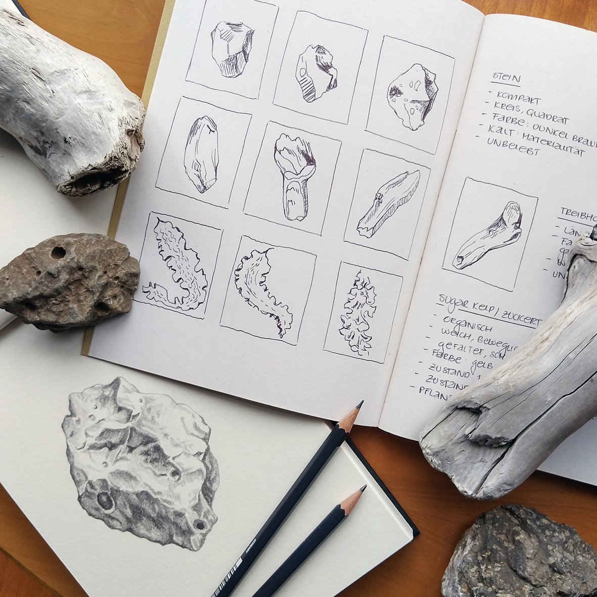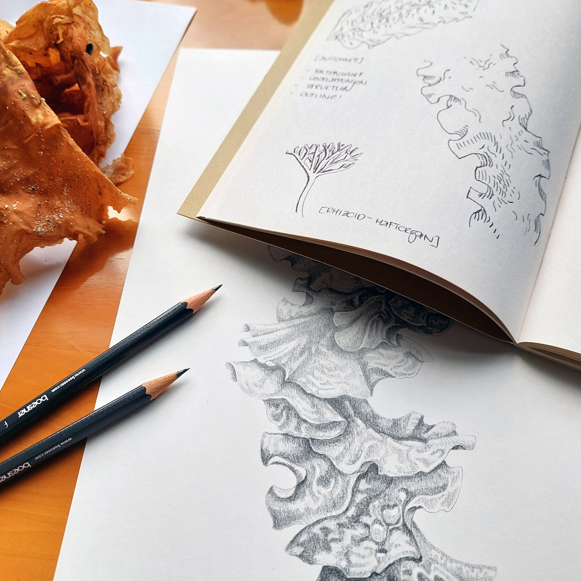 Second, we—as an illustrator (Elisa Debora Hofmann) and an environmental social scientist (Benjamin Hofmann)—explored the reported research activities on two levels. Through visual arts, we zoomed into local natural objects that represent the research activities described in the interviews. Based on ideas provided by the interviewees, we went out to find the objects in the environment of the Westfjords. Hand-drawn graphite illustrations study these five simple objects in depth. Paying close attention to the structure and materiality of these objects reveals their hidden beauty. By contrast, through social sciences, we zoomed out to generalizable contributions that science can make to resilient human-environment relations. Notably, we put examples from the interviews in relation to theoretical insights on the roles of science in society from scholarly literature in the inter- and transdisciplinary field of sustainability science. The result is a typology of the roles of science in the Anthropocene, visually illustrated with examples from the Westfjords.
