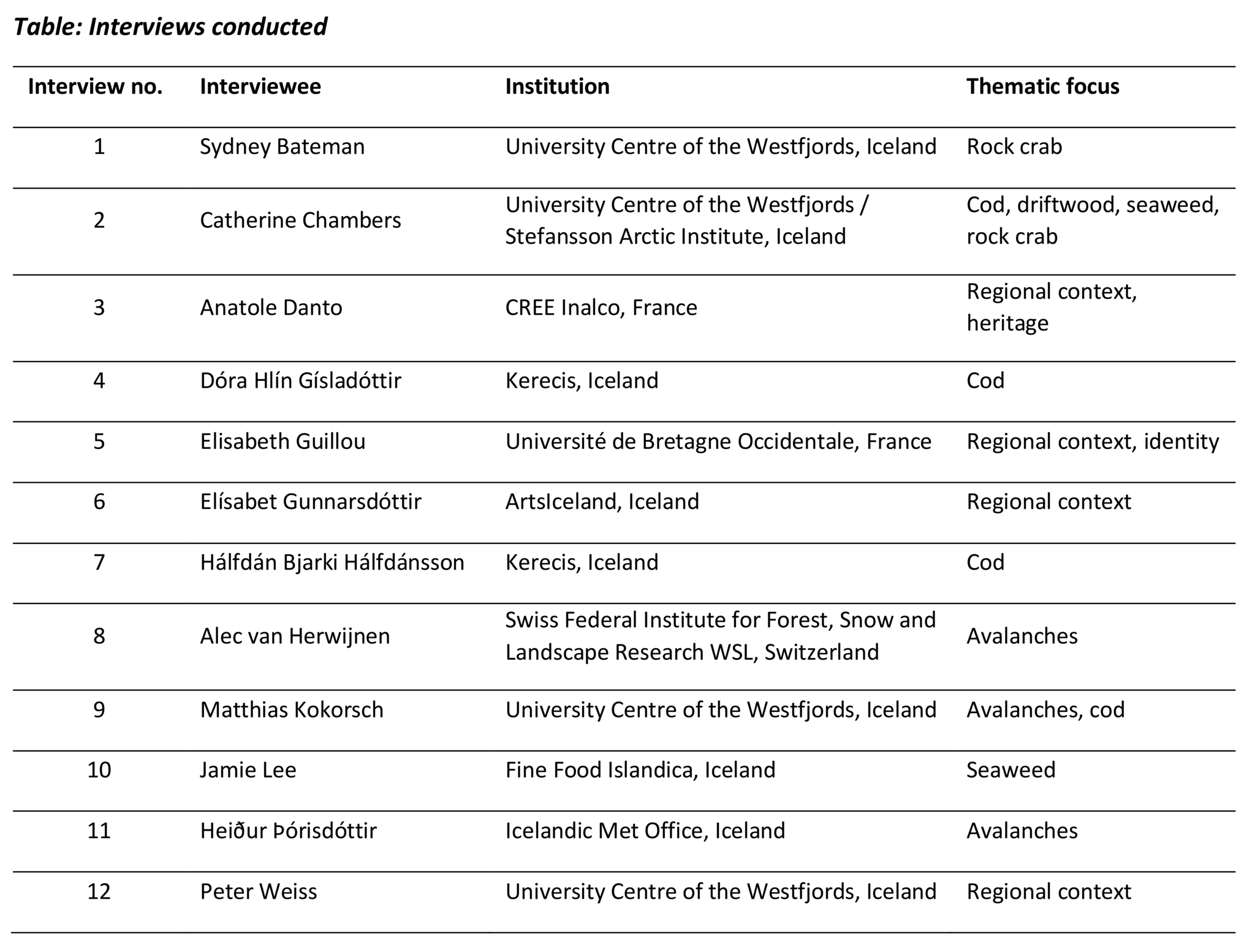 First, we conducted semi-structured interviews with researchers to learn about research activities related to human-environment relations in the Westfjords. We conducted a first set of preparatory interviews online, followed by a second and larger set of in-person interviews during a four-week research stay in the Westfjords. Interviewees included researchers from local organizations, such as the University Centre of the Westfjords, scientists from outside the Westfjords who conduct research in this region, and representatives from the arts and business with links to research. We documented interviews in the form of audio-records or written notes. Drawing on this material as well as on relevant scientific publications from different disciplines, we wrote up short summaries of five major research themes related to human-environment relations in the Westfjords. We asked our interviewees to validate the accurateness of these descriptions.