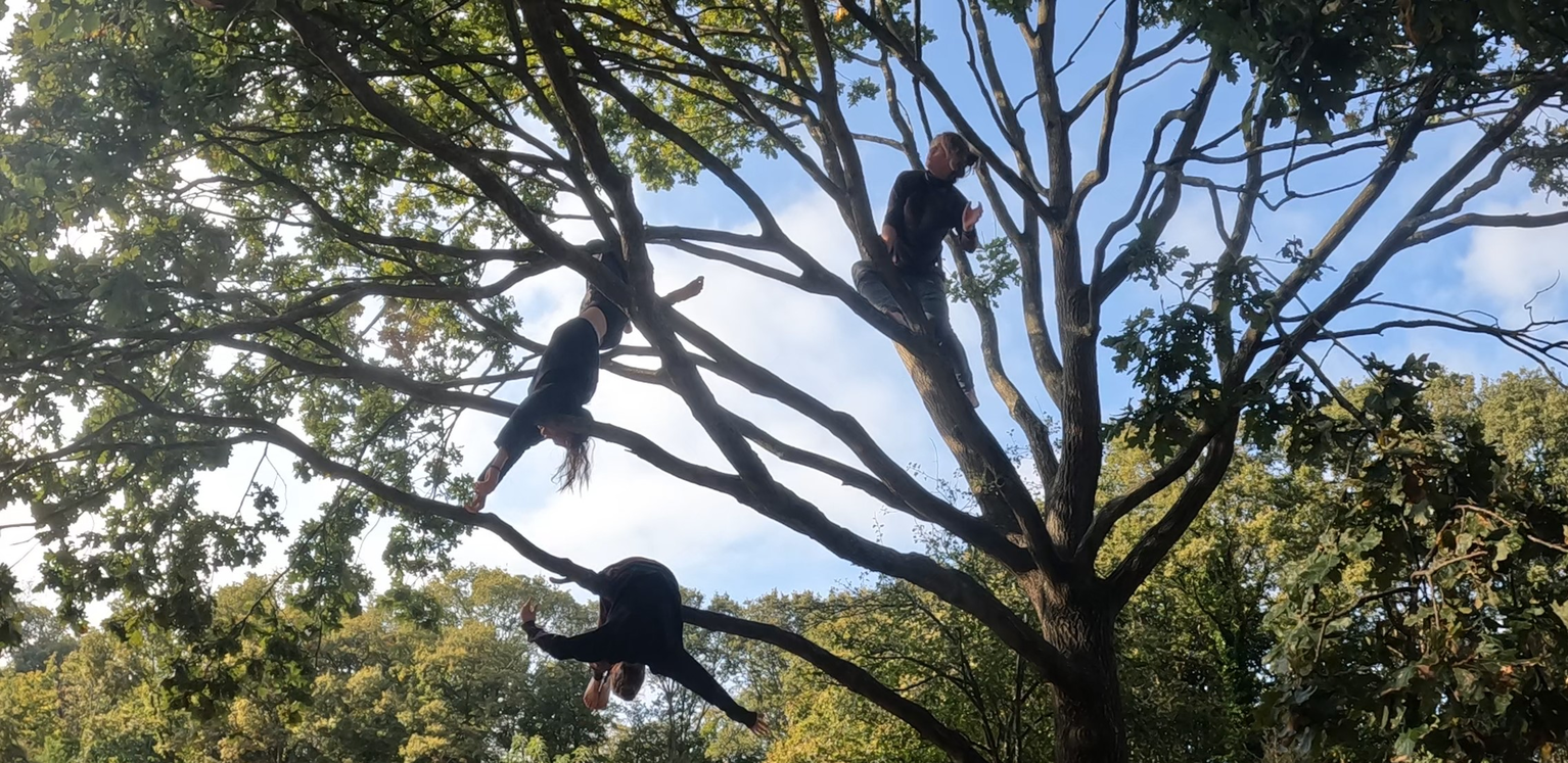 On the 15th October 2024, I invited two mover friends for this session: Mila, with a background in silks, and Nienke, who has experience in mountaineering and contemporary dance. Neither had worked in trees before, which made it an a fresh canvas for exploration. Just getting to the point of having two people to come join in the tree served as a challenge. Explaining that you will move in the trees, without harnesses seems to be a tough pill to swallow for some people.