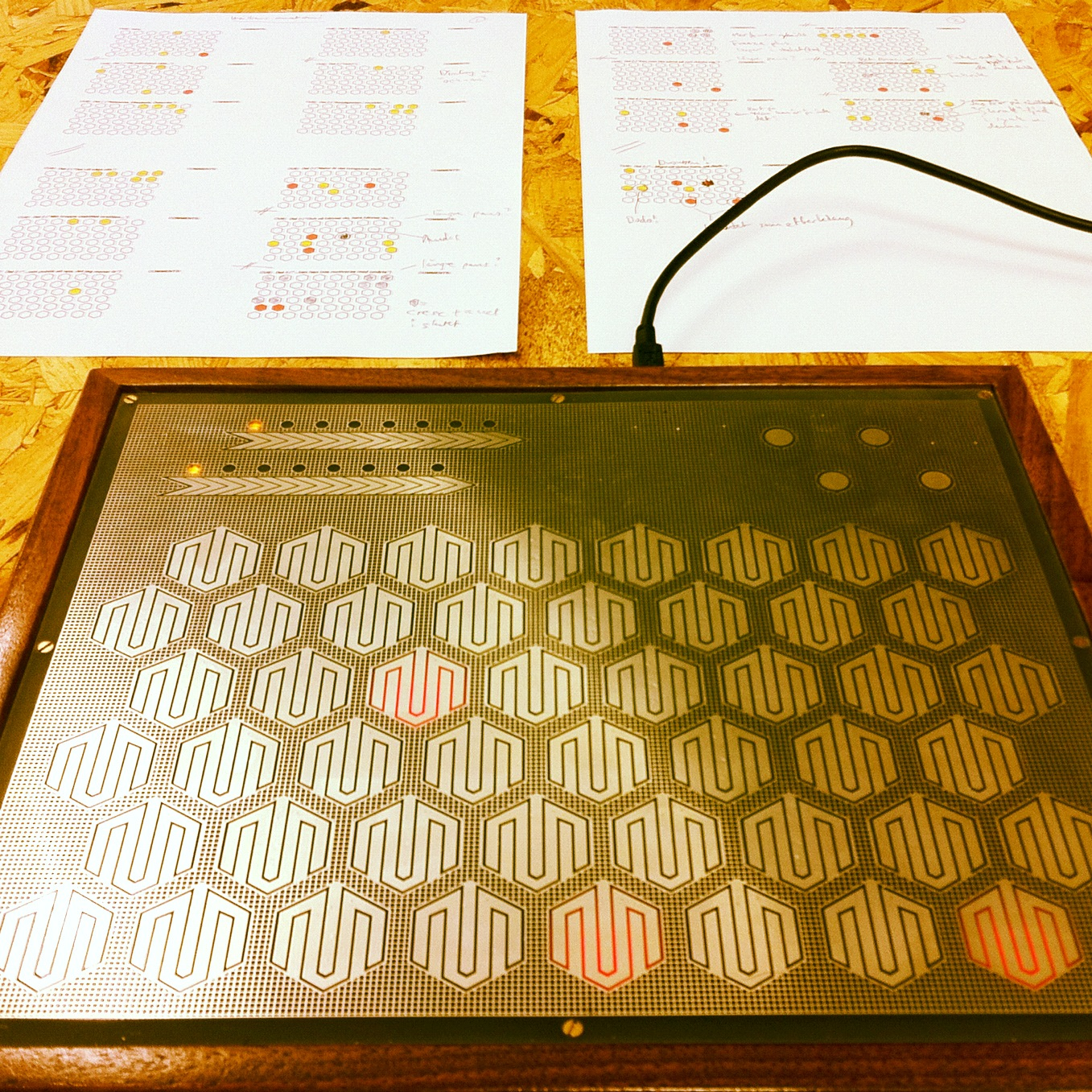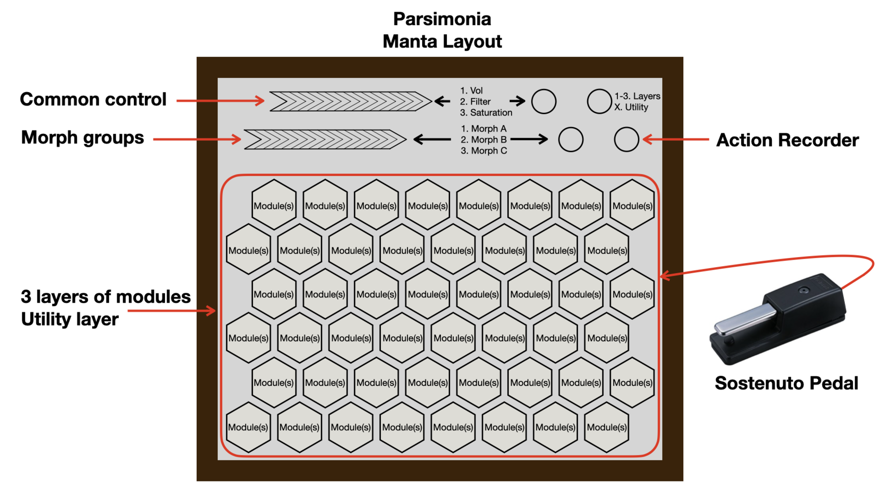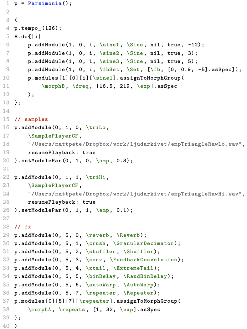 In the Parsimonia system, each hexagonal pad can be assigned one or more predefined modules of different types that generate or process sound or data. These module types include synths or samplers, SuperCollider patterns, hardware inputs, effects, MIDI note or MIDI control change, control voltage, and internal parameter control. A module can also be a whole composition, as further discussed in Patch 5: Triangular Progressions and Patch 8: Sinew0od for Buchla in the Patches section.