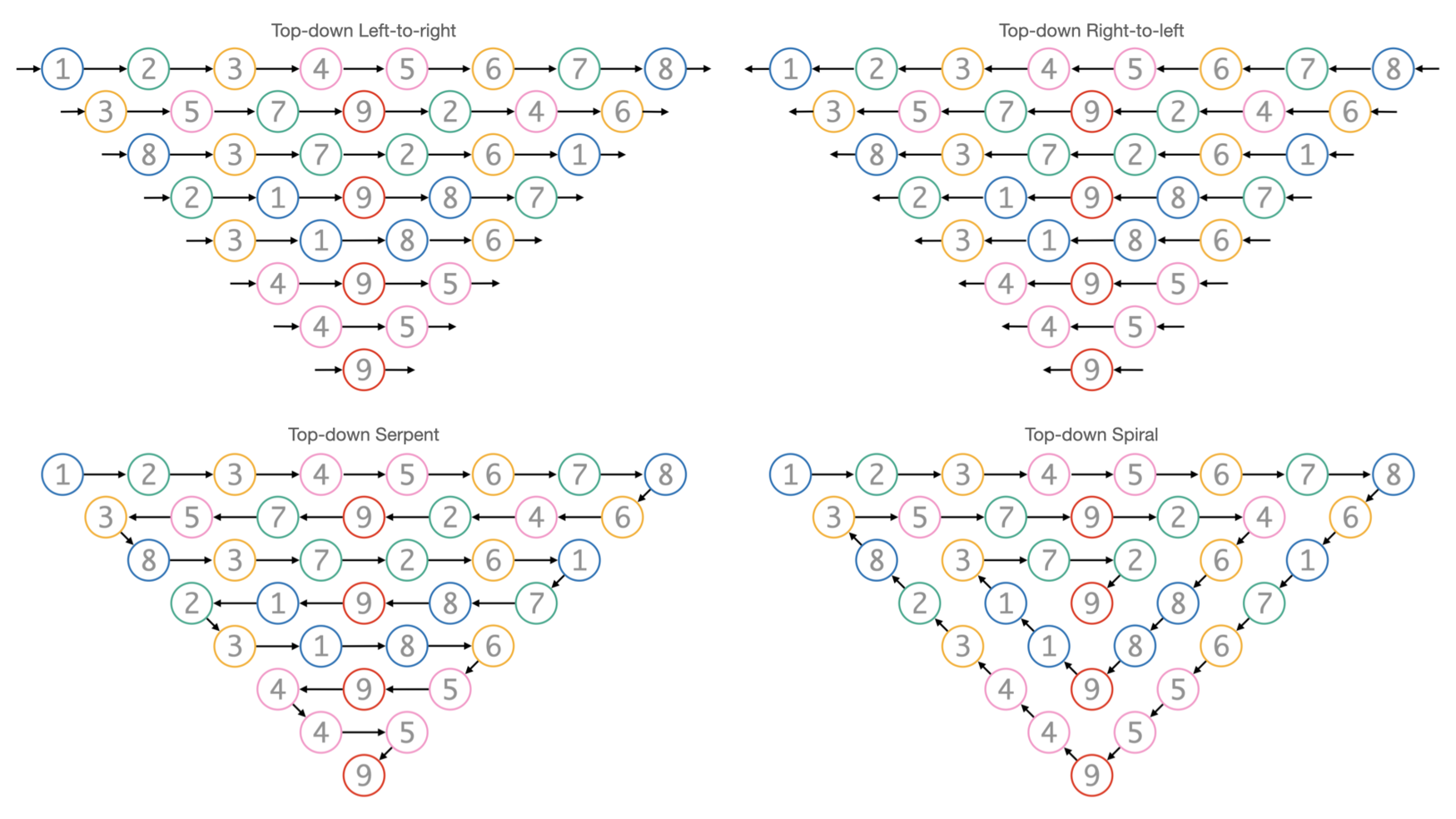 Traditional counterpoint techniques, such as inversion, mirroring, and mirrored inversion, as well as various transposition algorithms, could also be applied. As shown below, the triangle as a whole as well as individual rows can be rotated, mirrored, inverted, and further manipulated according to different algorithms.