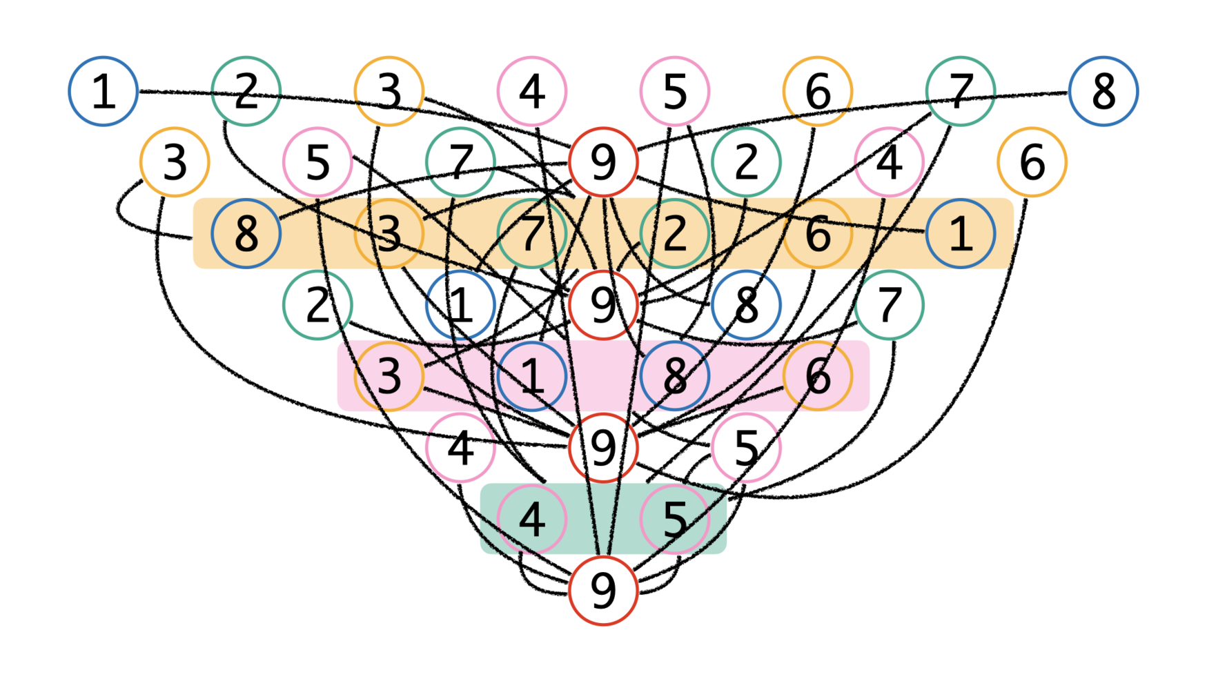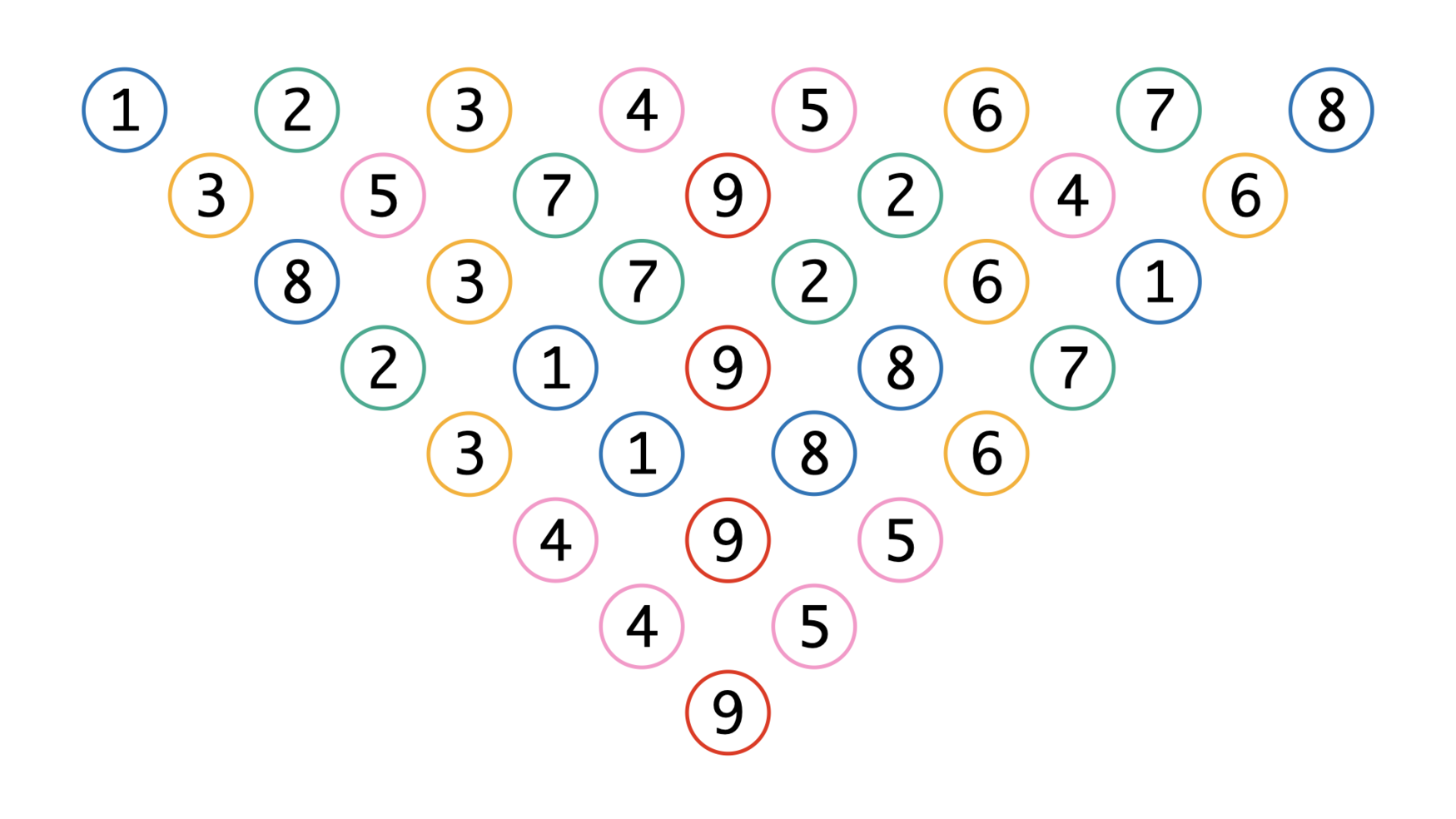 Over the years, I have developed a modular understanding of the triangle. Instead of applying a unidirectional notion of mapping, this enables a notion of multidimensional patching where digits, rows and symmetries can be used as modules that can be patched both internally and into certain musical dimensions or as containers for musical gestures or parts on a higher structural level. The patch example below shows internal connections between numbers 3, 5, and 7, and their corresponding rows (read from the top). The four nines are patched to 1 and 8, 2 and 7, 3 and 6, and 4 and 5, respectively.