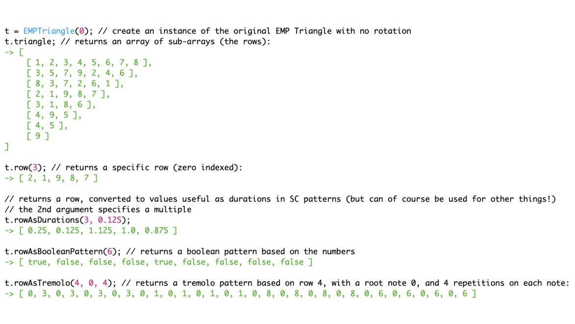 A crucial factor for the patching possibilities described here, is a SuperCollider implementation of the EMP Triangle. Working with the triangle in practice thus means that the connections are made in a coding interface. This, in turn, enables a simplified handling of complex patching, e.g., between several instances of the triangle, with different rotations and permutations, and a simplified mapping between musical structure and sonic control.