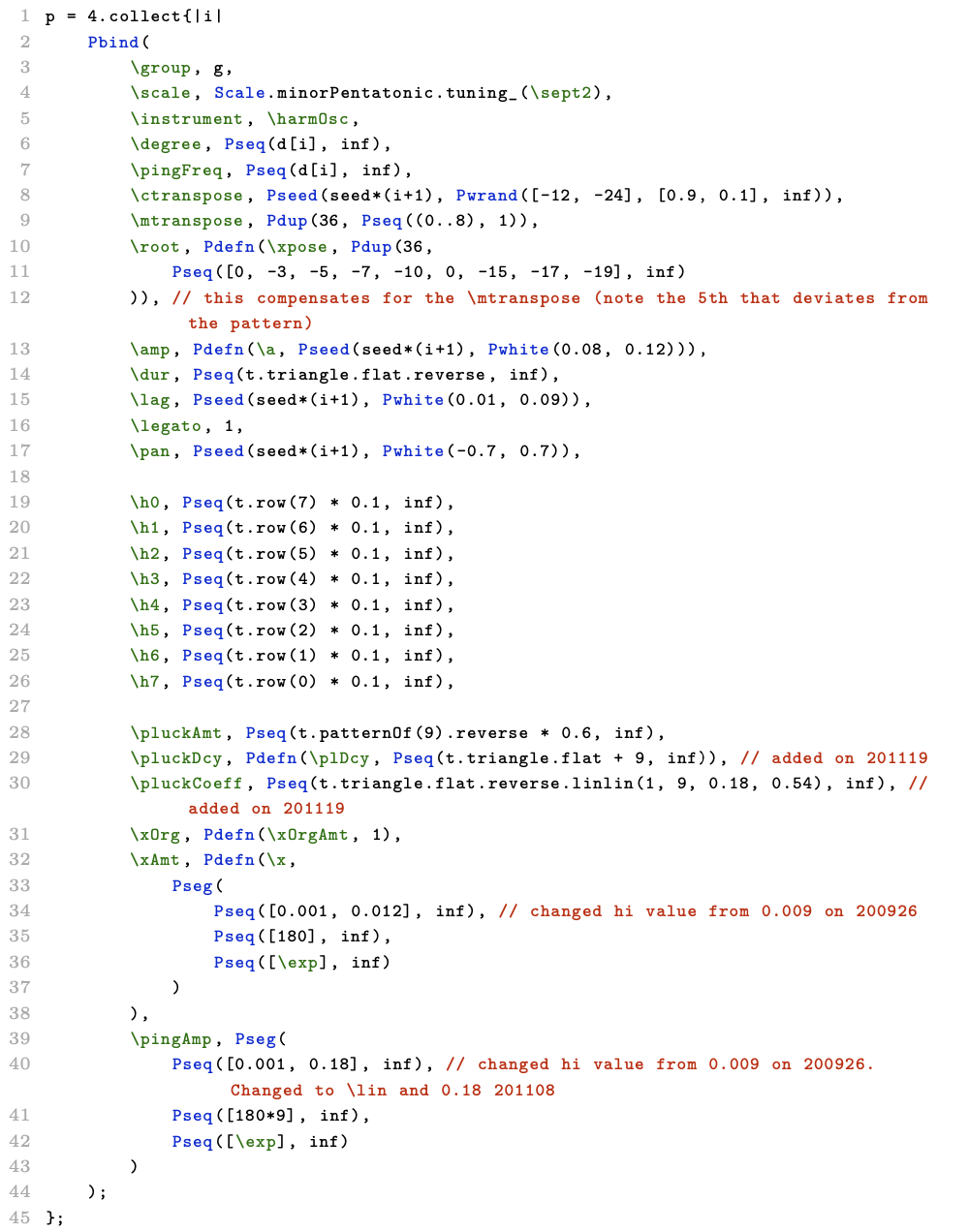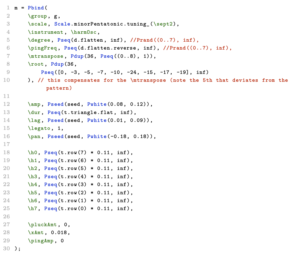 For the entire piece, the sequence of thirty-six chords is repeated nine times. Accents in the pattern occur four times in each repetition by emphasizing the level of the Pluck resonances, following the pattern of nines in the triangle, read bottom-top right-left (the \pluckAmt key on line 28 in above). There is also a subtle rhythmic pattern of hi-pitched 'pings' slowly fading in throughout the whole piece. These are based on an additional sine oscillator, amplitude modulated by a low frequency saw oscillator, where the frequencies for both are derived from the same sub-array that sets the scale degrees.