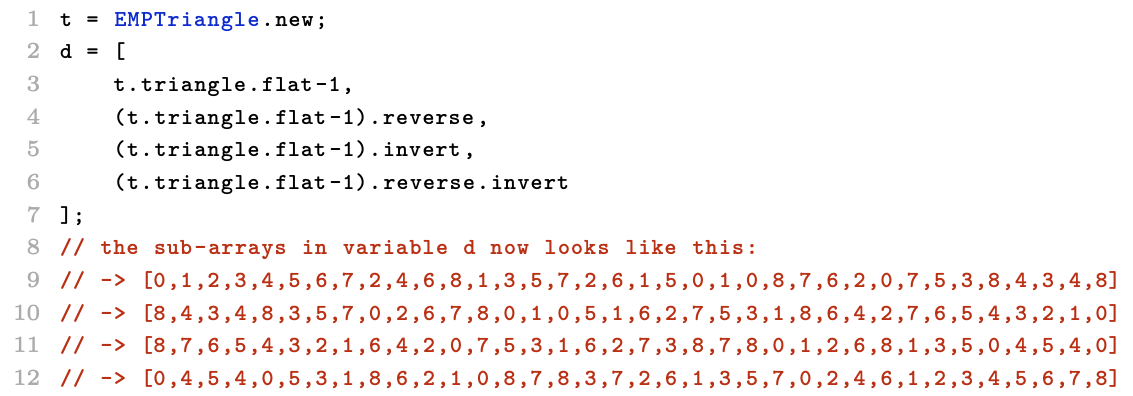 Another source of inspiration for this SynthDef and for the composition of Triangular Progressions was the notion of a pipe organ where the stops could be re-registered and individually modulated per note. The SuperCollider pattern library was used to perform these virtual registrations and the sequences were generated by the EMP Triangle, further explained below. The code above shows the construction of an array with four different readings of the entire sequence of numbers in the triangle. The first is a left-right top-bottom reading, the second reads right-left bottom-top, and the third and fourth are inverting the number sequences around the default axis (which is the sum of the minimum and maximum values of the array). Scale degrees in SuperCollider are zero indexed, hence the -1 on these arrays.