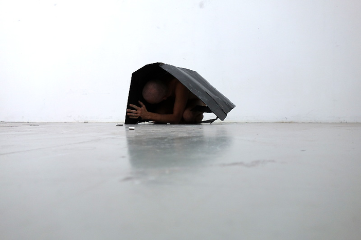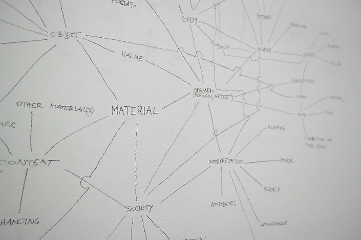 The aforementioned questions result from practical working processes. In it, a set of perception-vectors point in different directions, such as recognizing the different appearance of materials, their interconnected behaviour in space, the relation of the artist's body to those materials and its own interconnected materiality, and so on.