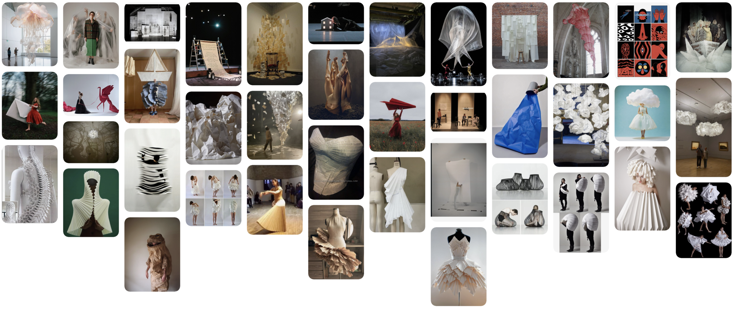 Abajo presentamos nuestros referentes en Pinterest sobre la relación que nos interesa investigar entre cuerpo y papel, donde el material se convierte en una extensión del propio cuerpo.