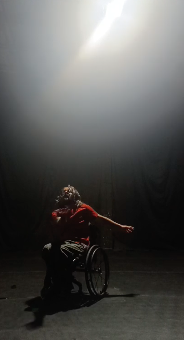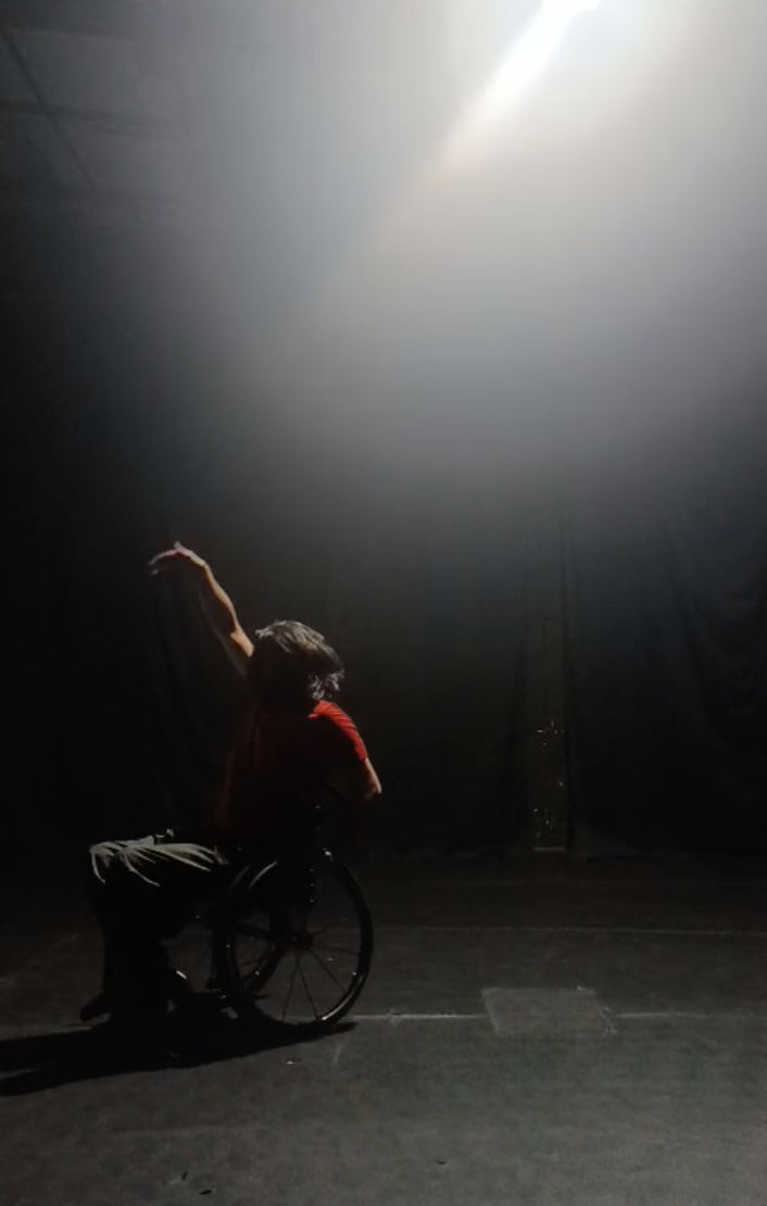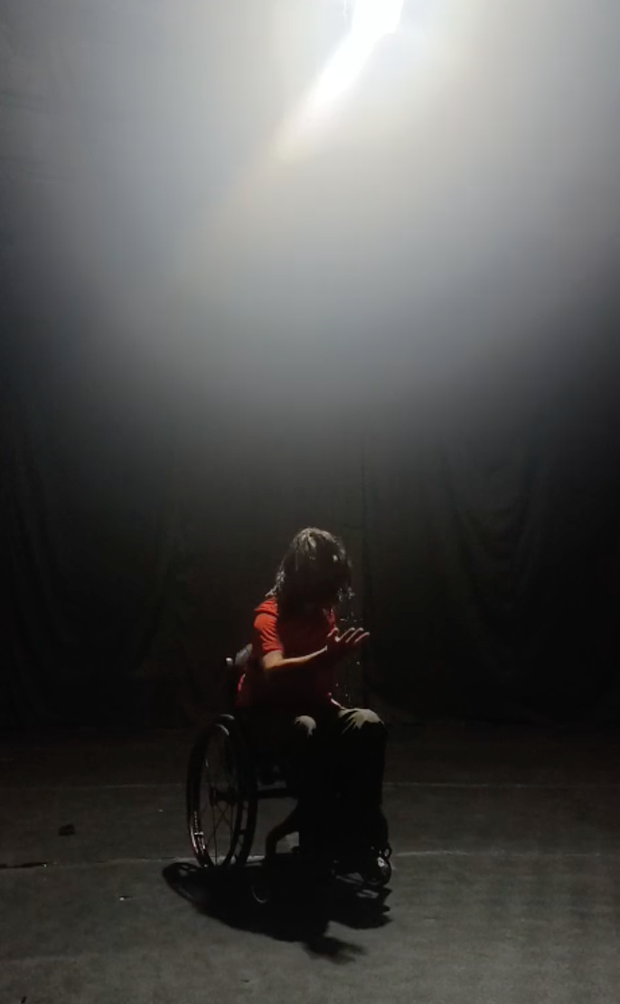 En “Cancionero para la Ausencia” hubo una escena en la que utilicé un cinturón y un pulpo para mantenerme pegado a la silla, de manera que pudiera mantener mi vértice ajustado al de la silla. En esa obra era solo una escena, pero en FOCARIS estoy explorando esto de manera que me permito liberar los brazos y descolgar mi tronco sin riesgo de que me salga de la silla. Esto, además, permite que cualquier compañere pueda subirse a mis piernas sin riesgo de que los pies se salgan del apoyapiés.