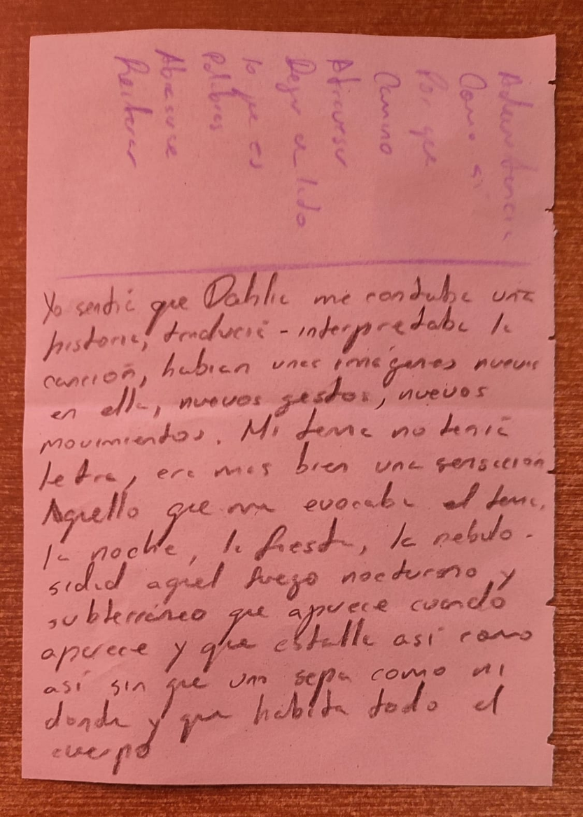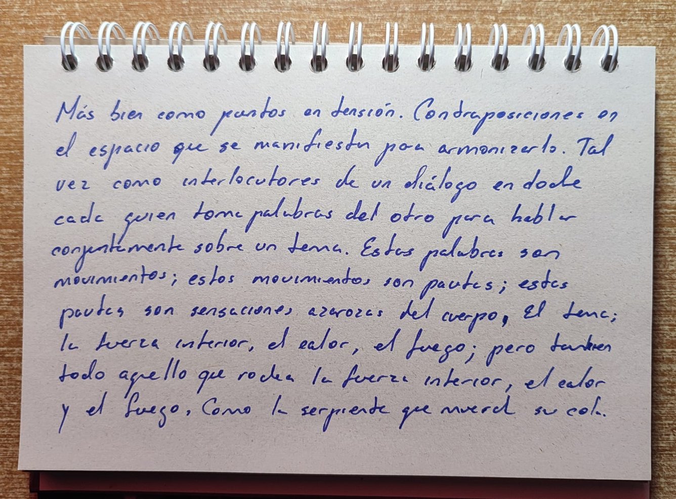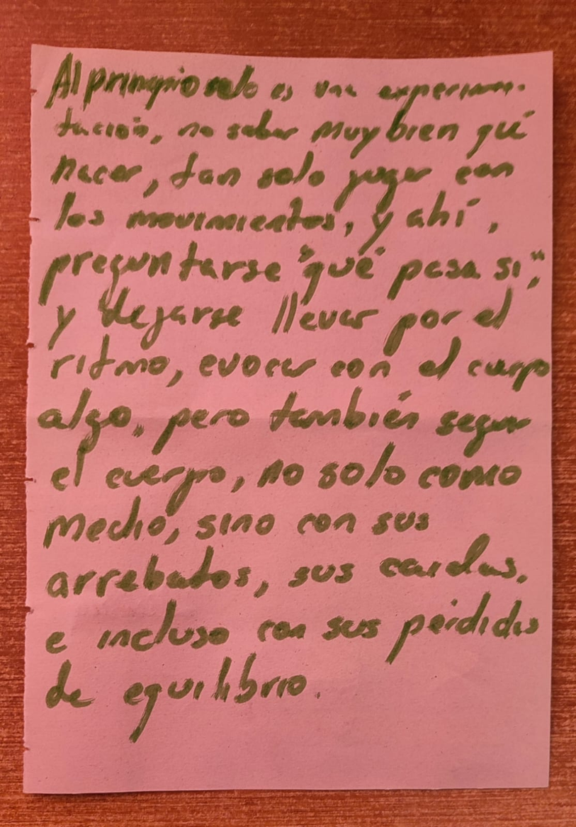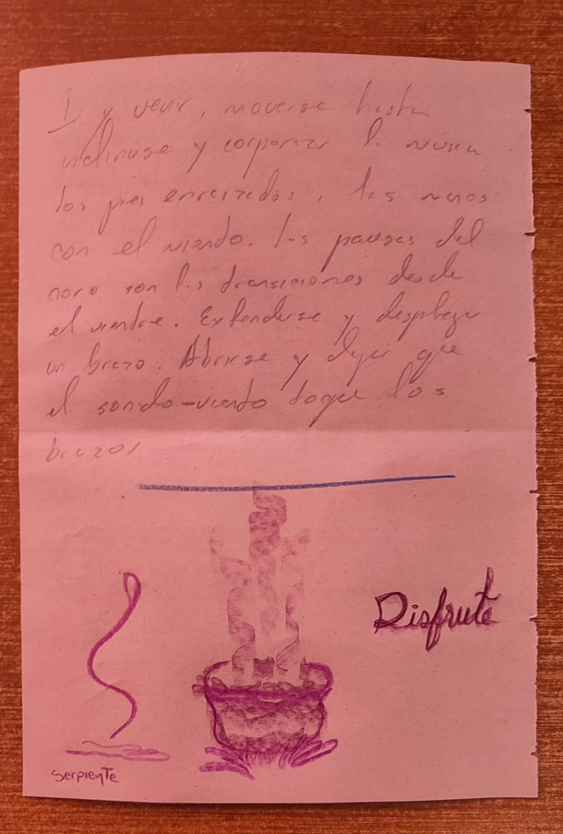 Otra investigación que realizamos consistió en ver a una compañera bailando su tema sin que supieramos que estaba escuchando. Esta actividad la realizamos en parejas. Al final anotabamos algunas palabras y cada uno le daba regalos a su compañera a partir de la sensación que le había producido el solo. Dahlia me regaló la experiencia del movimiento de la serpiente y evocó una suerte de caldero que nacia de mis piernas en donde del humo que se deprendía nacia el movimiento.