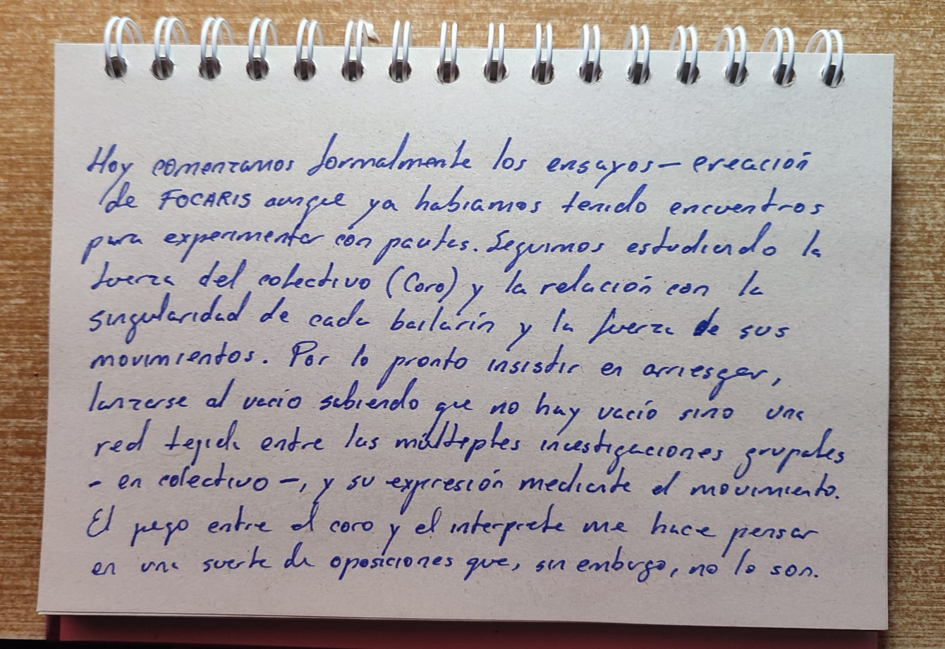 Considero que esta primera etapa estuvo marcada por dos momentos. El primero fue la breve residencia que tuvimos a principios del mes de junio con la Visita de Laisvie, en donde nos fue revelada la idea general de la obra y, a manera de experiementación, investigamos algunas intuiciones en torno al Coro, a los Solos de cada bailarin/na y a la relaciones cinéticas que se estabelcian (o buscaban establecerce) entre estos dos roles dramatúrgicos de lo que será FOCARIS. Esta investigación estuvo marcada por el taller que realizamos a principios de año en la Zona de Creación Accesibre con Jose Mejia, en donde exploramos una suerte de estado escenico que estuviera alerta y atento a los movimientos del compañero/a para generar así movimientos propios. En la residencia de Laisvie encontramos una necesidad por irrumpir en el espacio sin temor alguno cada quien con su movimiento buscando revelar una fuerza interior. Al mismo tiempo, descubrimos que el coro mas que un rol pasivo, consiste en retroalimentar y hacer eco de la fuerza del solista. Mientras atiende y le da foco al solo, va componiendo y armoniando el escenario, tambien en un estado de atención y escucha.