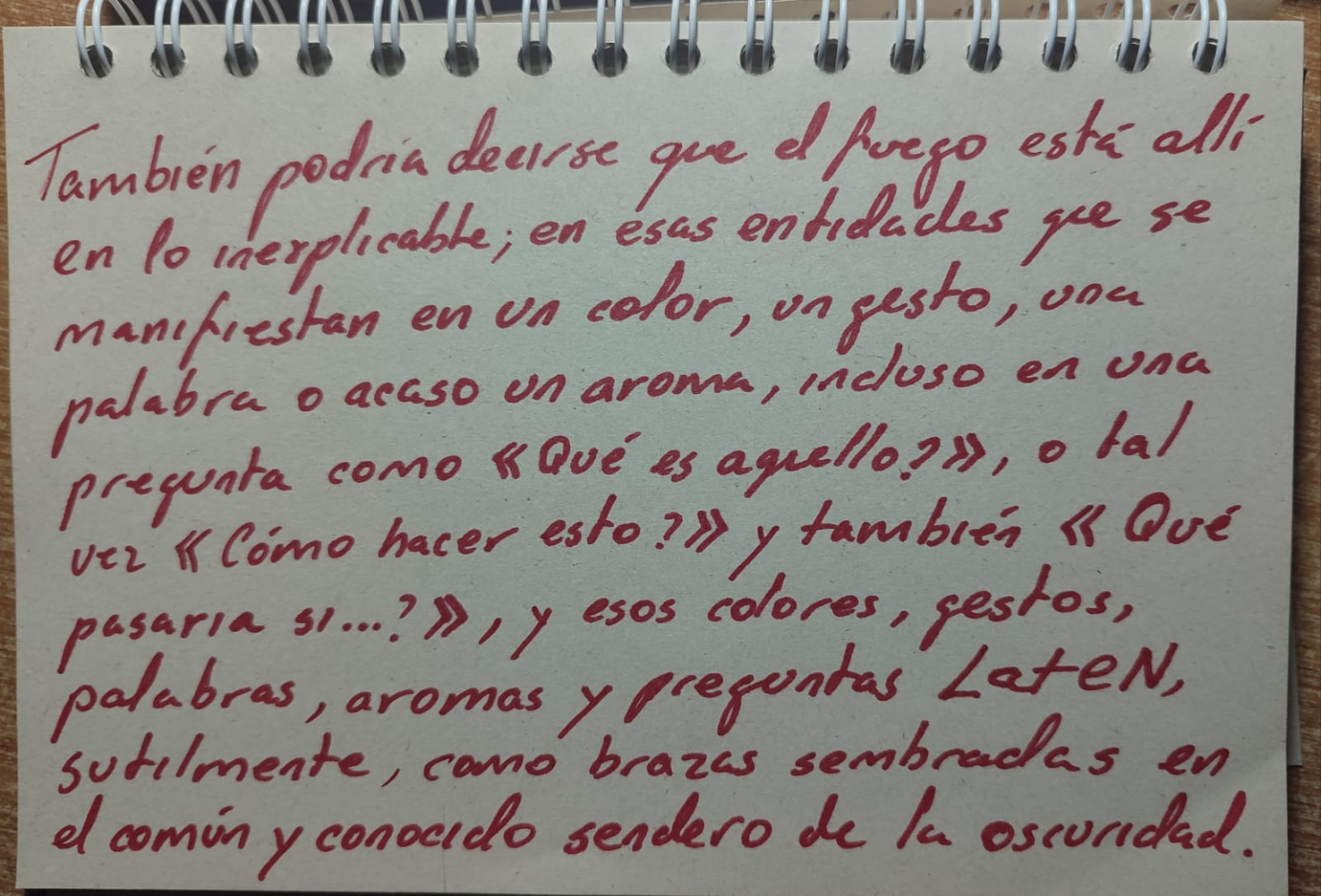 Mi fuego, o acaso mi luz interior, nace de una búsqueda experiemental en torno al misterio de estar vivo, que se ocupa del mas acá y se inclina a olfatear intuiciones, pensamientos y sensaciones como guias de autorealización para mantener el ímpetu ardiendo.