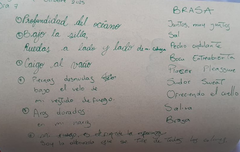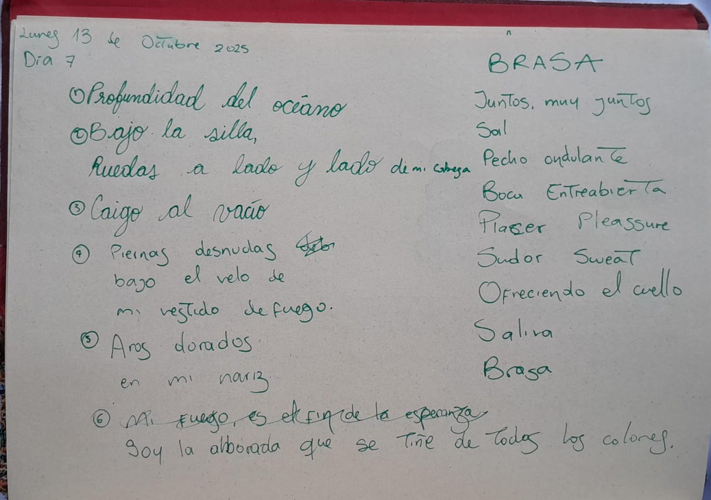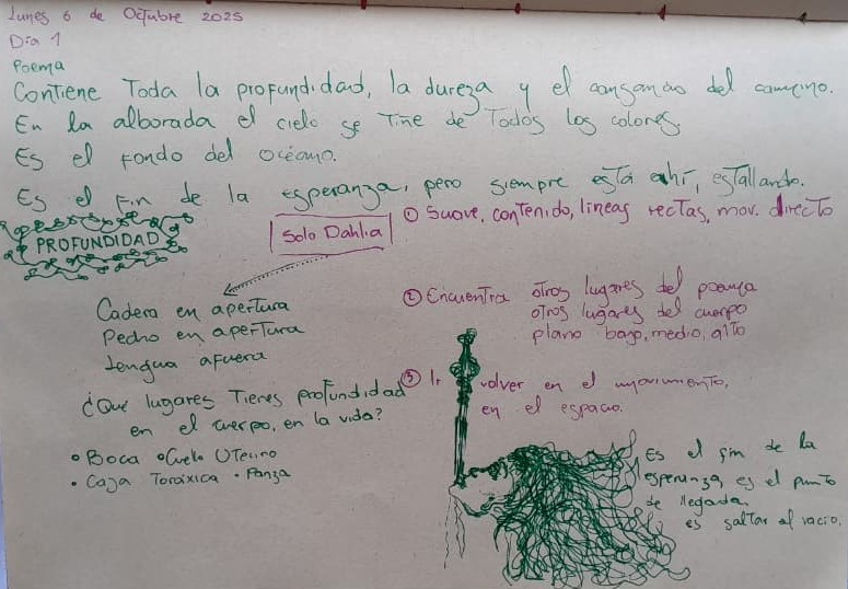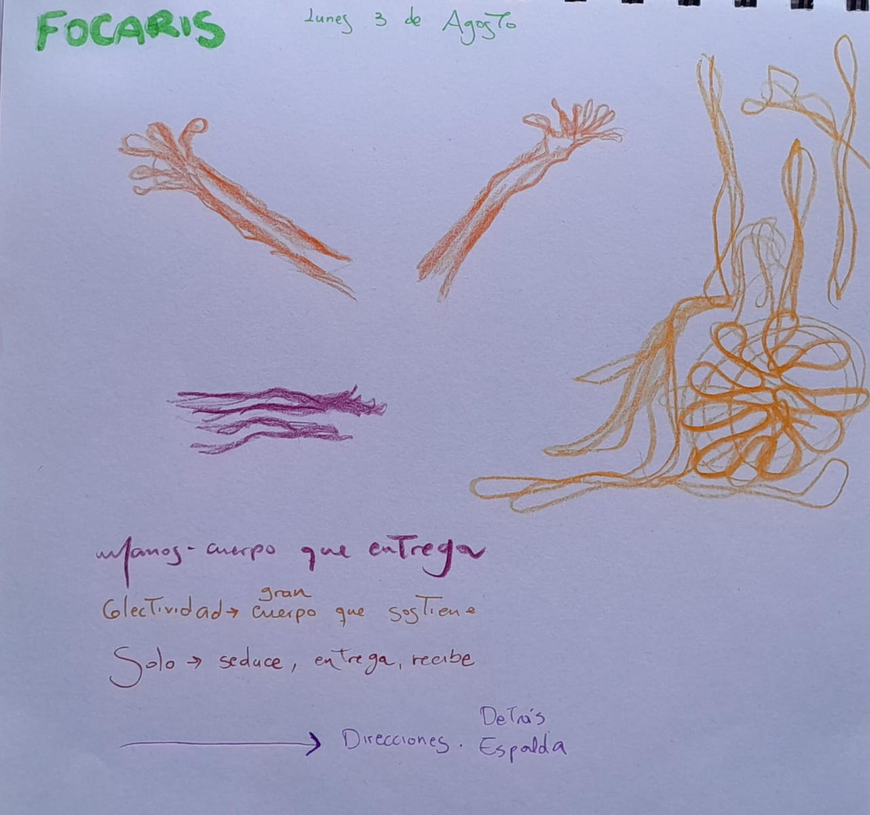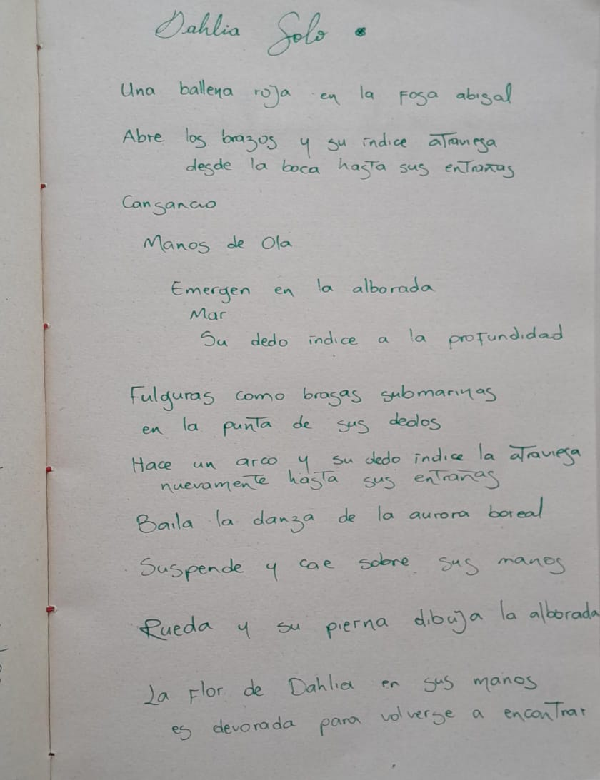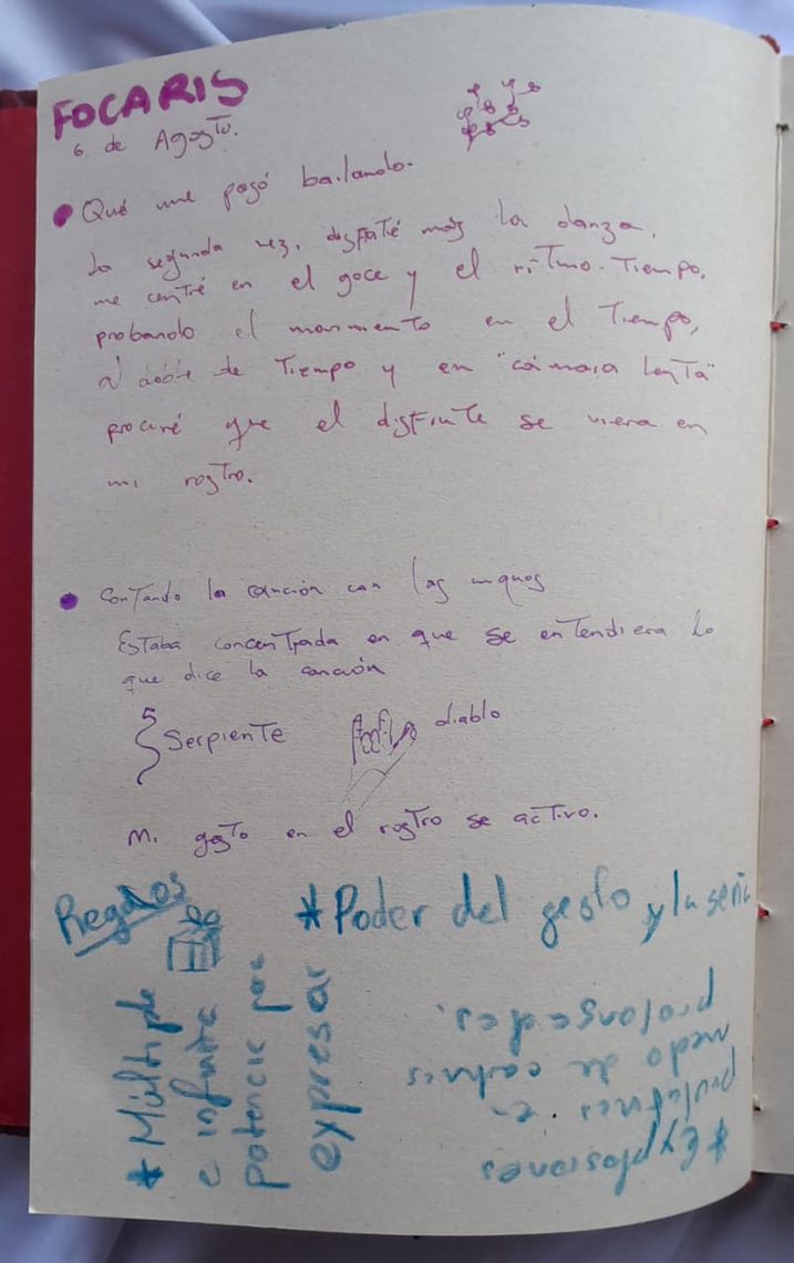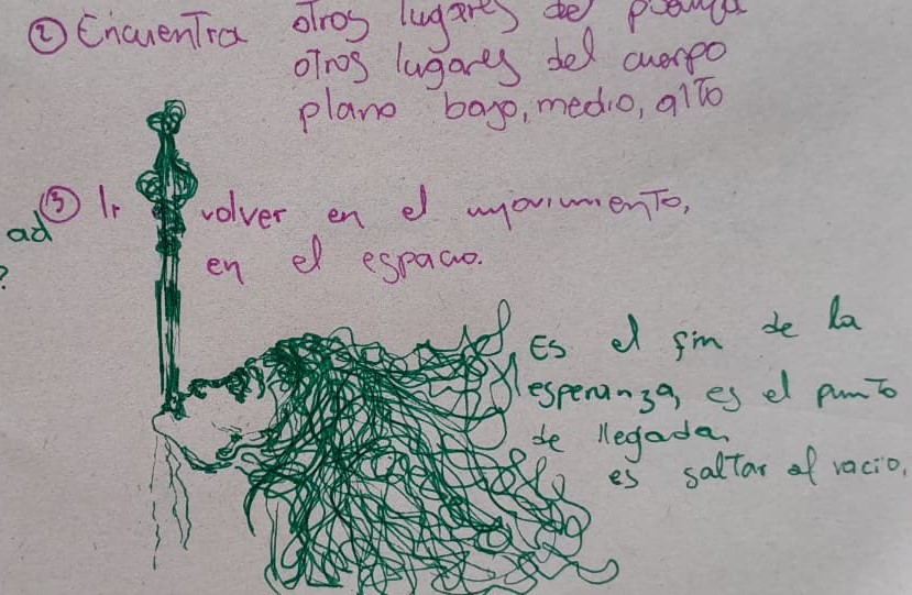Aprendí en lengua de señas una parte de mi escrito -cómo es mi fuego interno-, para generar movimiento y -lengua de señas expandida-, término que usamos en Concuerpos para referirnos a un movimiento que tiene como base la lengua de señas pero se hace con todo el cuerpo y se involucra en la danza.