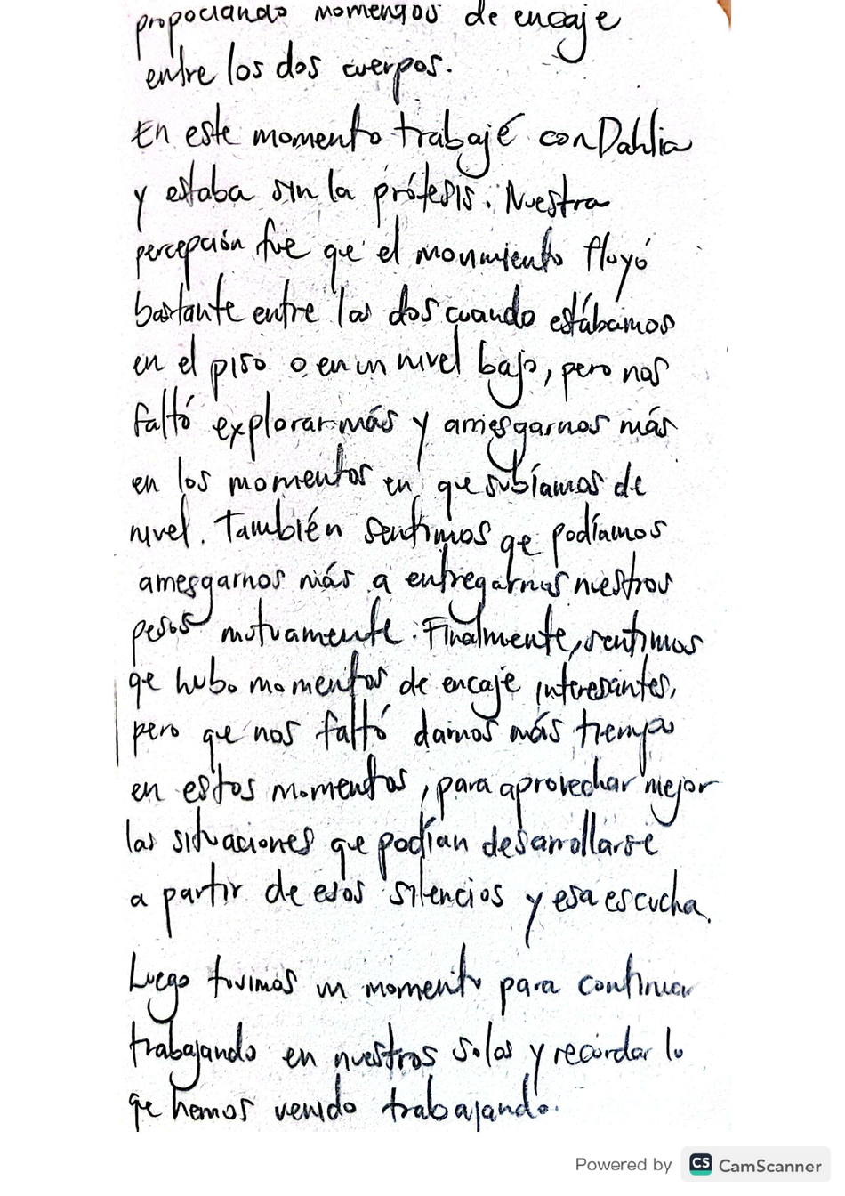 En este momento trabajé con Dahlia, y estaba sin la prótesis. Nuestra percepción fue que el movimiento fluyó bastante entre las dos cuando estábamos en el piso o en un nivel bajo, pero sentimos que nos faltó explorar más y arriesgarnos más en los momentos en los que subíamos de nivel. También sentimos que podíamos arriesgarnos más a entregarnos nuestros pesos mutuamente.