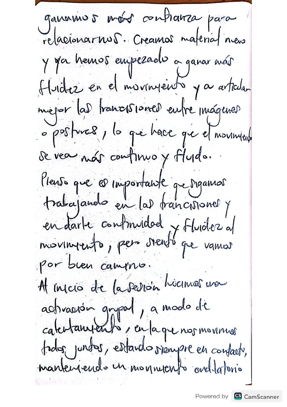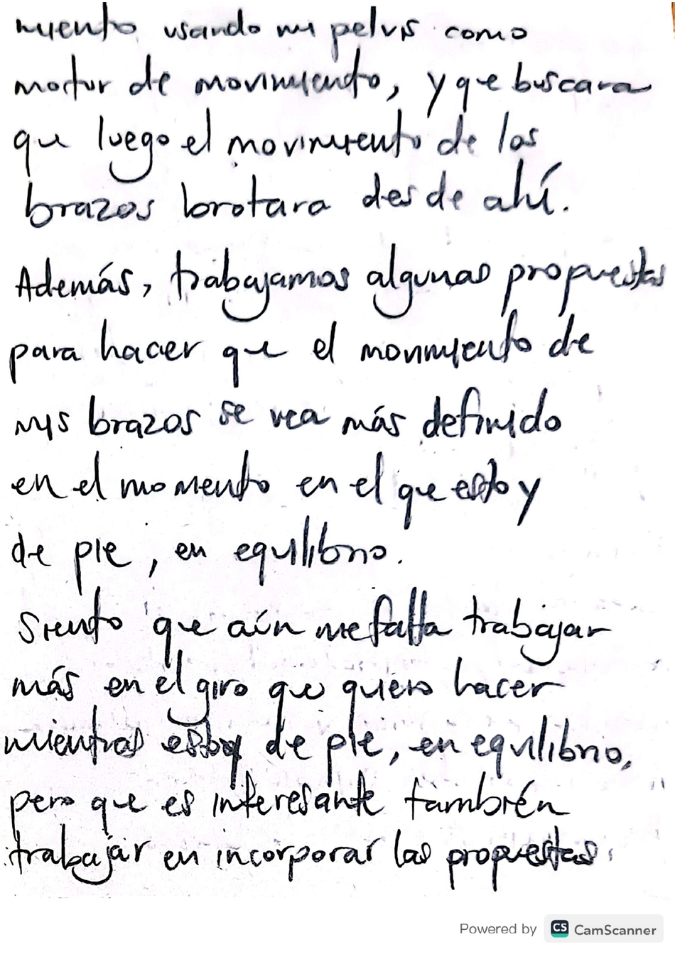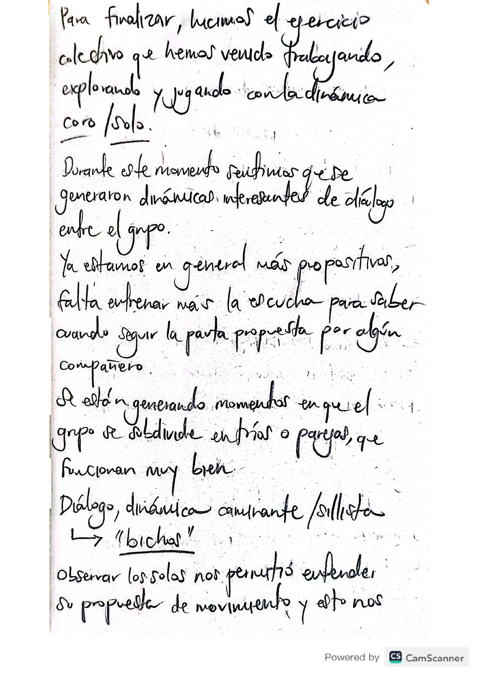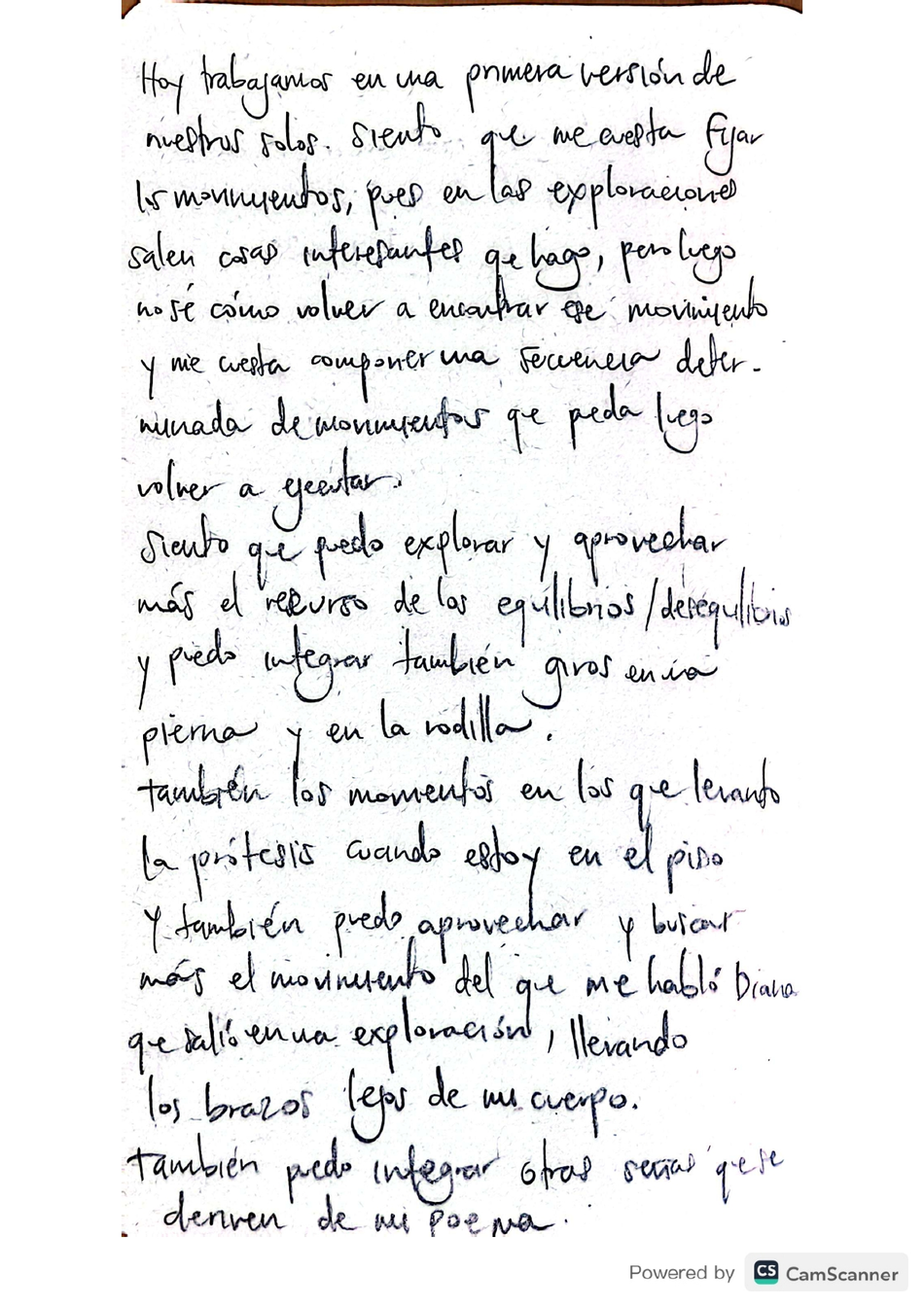 Hoy trabajamos en una primera versión de nuestros solos. Al respecto, siento que me cuesta fijar los movimientos, pues en las exploraciones siento que salen cosas interesantes en lo que hago, pero luego no sé cómo volver a encontrar ese movimiento y me cuesta componer una secuencia definida de movimiento, que pueda luego volver a ejecutar.